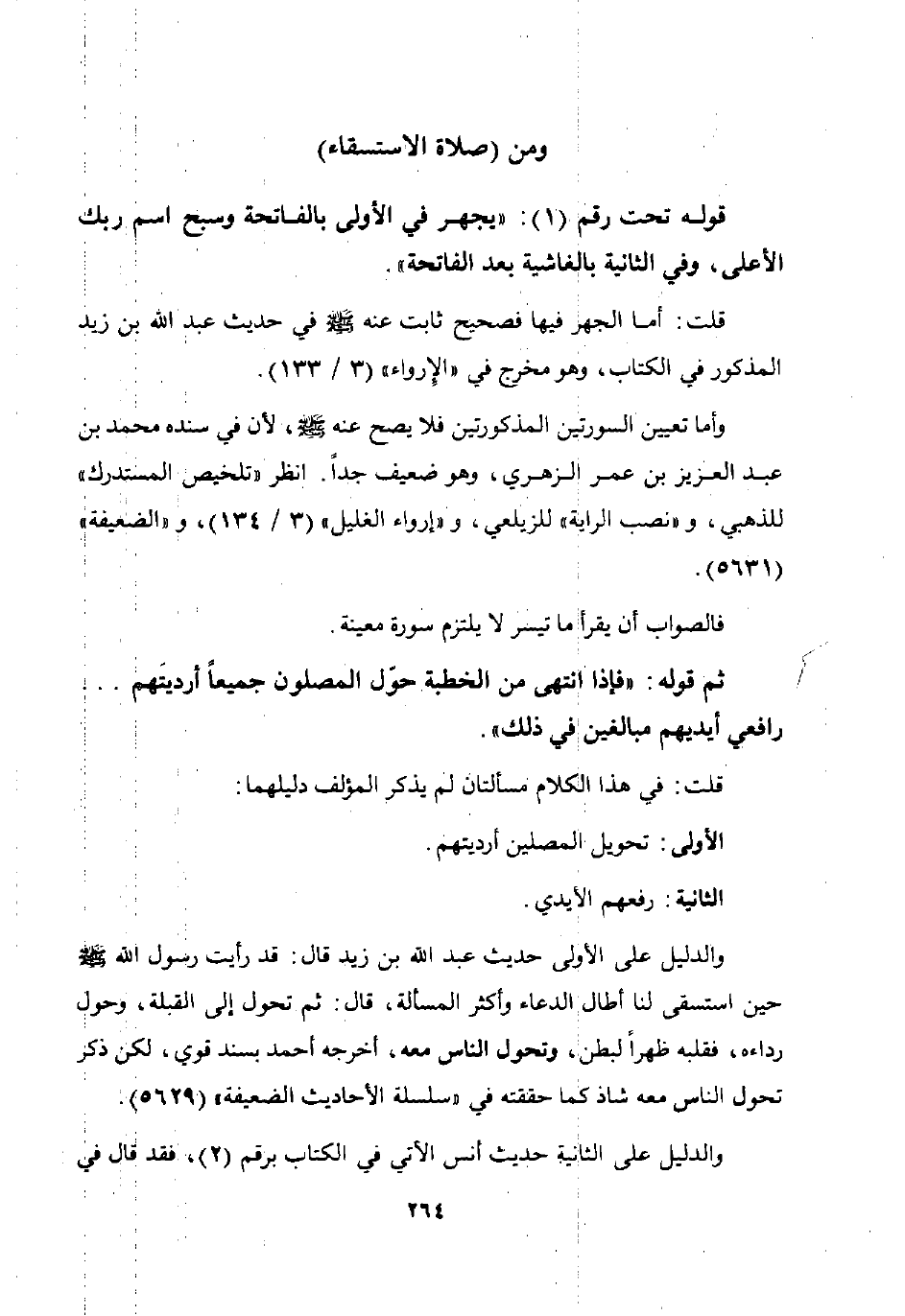 والدليل على الأولى حديث عبد الله بن زيد قال: قد رأيت رسول الله صلى الله عليه وسلم حين استسقى لنا أطال الدعاء وأكثر المسالة قال: ثم تحول إلى القبلة وحول رداءه فقلبه ظهرا لبطن وتحول الناس معه أخرجه أحمد بسند قوي لكن ذكر تحول الناس معه شاذ كما حققته في "سلسلة الأحاديث الضعيفة" 5629.