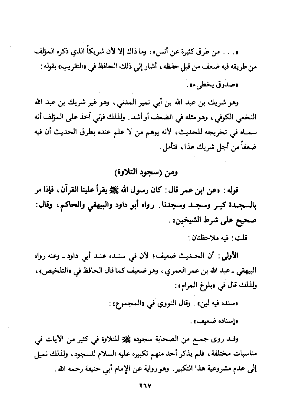 قوله: "عن ابن عمر قال: كان رسول الله صلى الله عليه وسلم يقرأ علينا القرآن فإذا مر بالسجدة كبر وسجد وسجدنا. رواه أبو داود والبيهقي والحكم وقال: صحيح على شرط الشيخين".