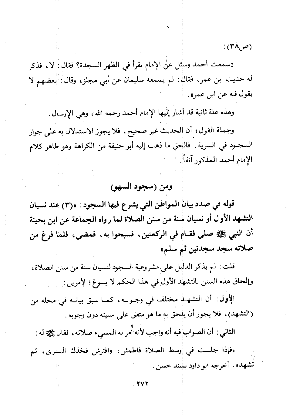 وجملة القول أن الحديث غير صحيح فلا يجوز الاستدلال به على جواز السجود في السرية. فالحق ما ذهب إليه أبو حنيفة من الكراهة وهو ظاهر كلام الإمام أحمد المذكور آنفا.