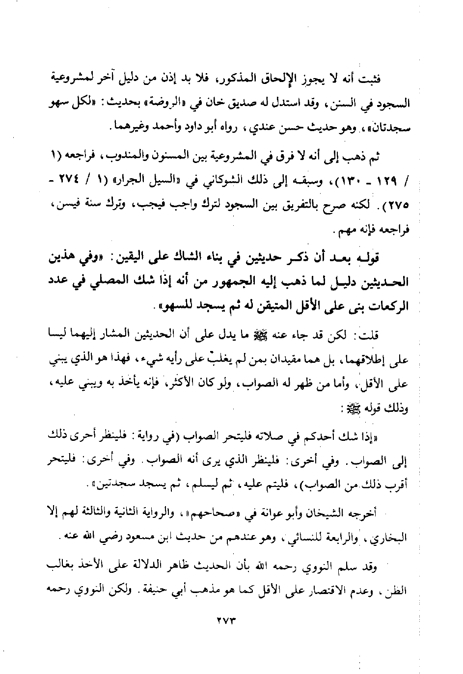 قوله بعد أن ذكر حديثين في بناء الشاك على اليقين: "وفي هذين الحديثين دليل لما ذهب إليه الجمهور من أنه إذا شك المصلي في عدد الركعات بنى على الأقل المتيقن له ثم يسجد للسهو".