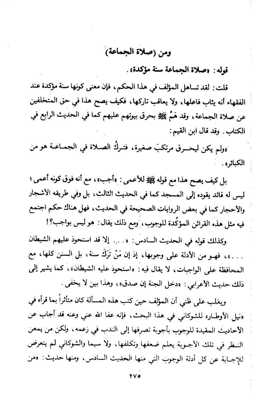 وكذلك قوله في الحديث السادس: " ... إلا قد استحوذ عليهم الشيطان ... " فهو من الأدلة على وجوبها إذ إن من ترك سنة بل السنن كلها مع المحافظة على الواجبات لا يقال فيه: "استحوذ عليه الشيطان" كما يشير إلى ذلك حديث الأعرابي: "دخل الجنة إن صدق" وهذا بين لا يخفى.