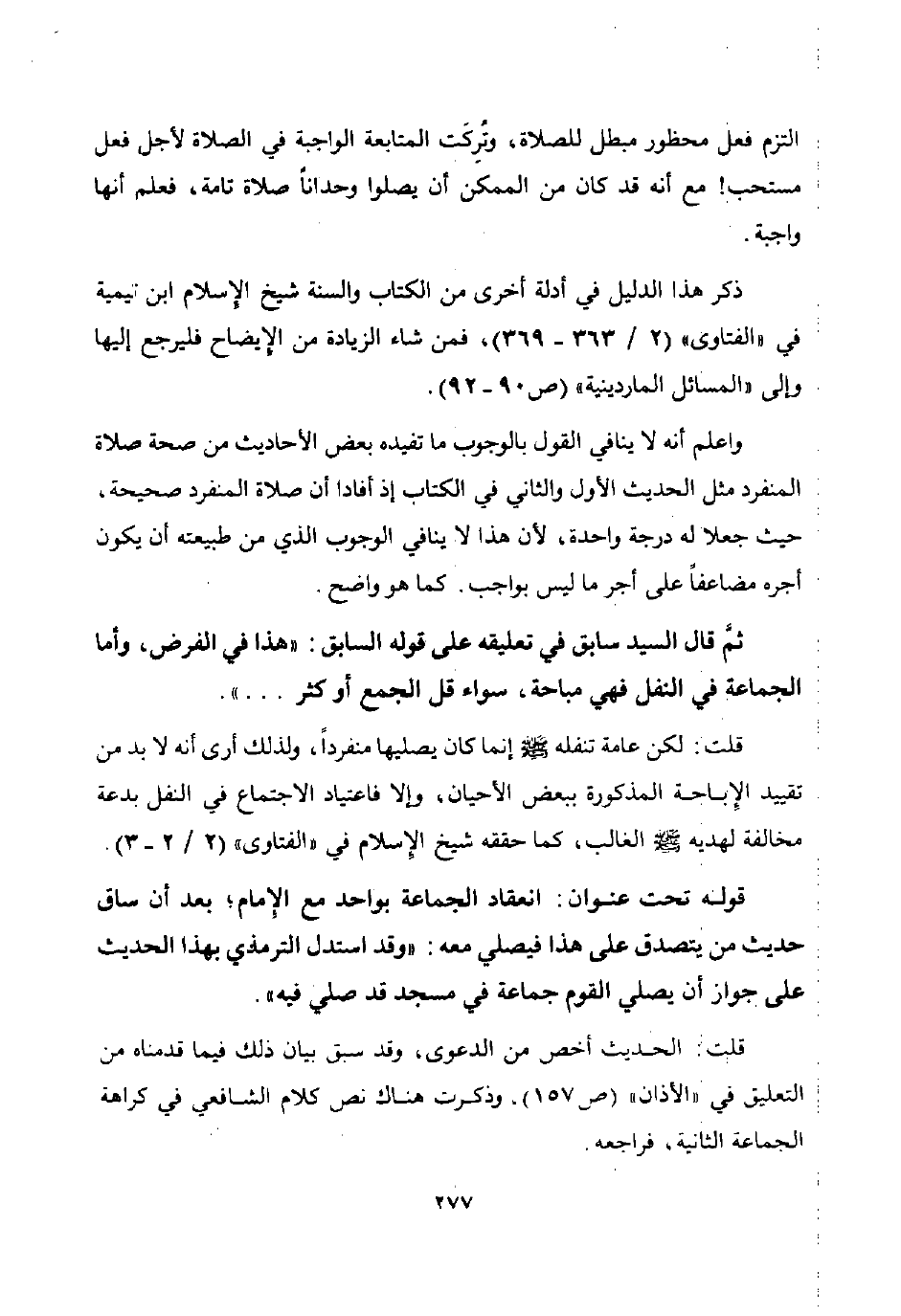 واعلم أنه لا ينافي القول بالوجوب ما تفيده بعض الأحاديث من صحة صلاة المنفرد مثل الحديث الأول والثاني في الكتاب إذ أفادا أن صلاة المنفرد صحيحة حيث جعلا له درجة واحدة لأن هذا لا ينافي الوجوب الذي من طبيعته أن يكون أجره مضاعفا على أجر ما ليس بواجب. كما هو واضح.