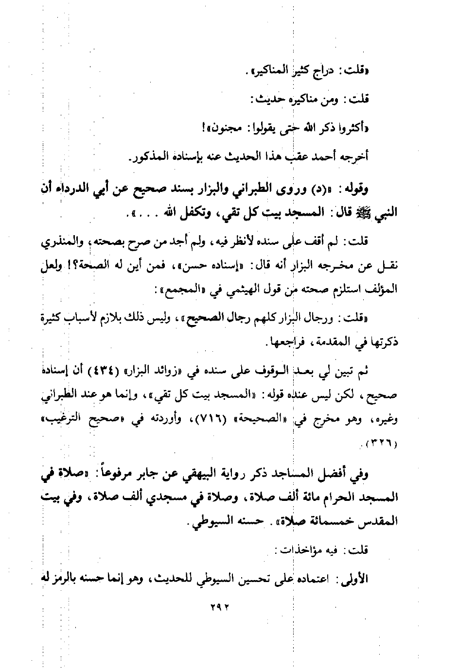 وفي أفضل المساجد ذكر رواية البيهقي عن جابر مرفوعا: "صلاة في المسجد الحرام مائة ألف صلاة وصلاة في مسجدي ألف صلاة وفي بيت المقدس خمسمائة صلاة". حسنه السيوطي.
