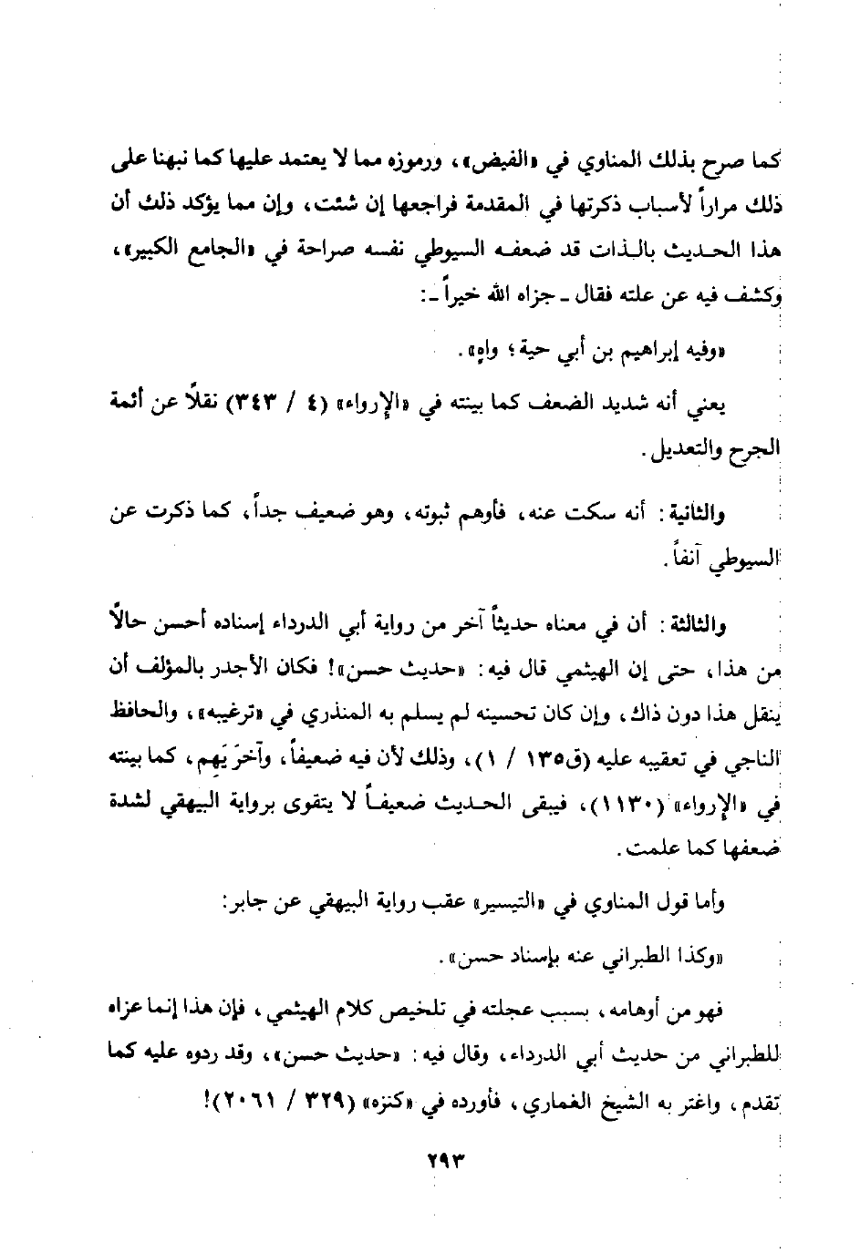 والثالثة: أن في معناه حديثا آخر من رواية أبي الدرداء إسناده أحسن حالا من هذا حتى إن الهيثمي قال فيه: "حديث حسن"! فكان الأجدر بالمؤلف أن ينقل هذا دون ذاك وإن كان تحسينه لم يسلم به المنذري في "ترغيبه" والحافظ الناجي في تعقيبه عليه ق 135 / 1 وذلك لأن فيه ضعيفا وآخر يهم كما بينته في "الإرواء" 1130 فيبقى الحديث ضعيفا لا يتقوى برواية البيهقي لشدة ضعفها كما علمت.