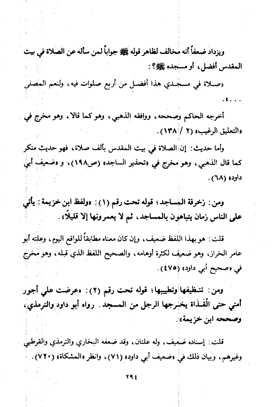ومن: زخرفة المساجد قوله تحت رقم 1: "ولفظ ابن خزيمة: يأتي على الناس زمان يتباهون بالمساجد ثم لا يعمرونها إلا قليلا".