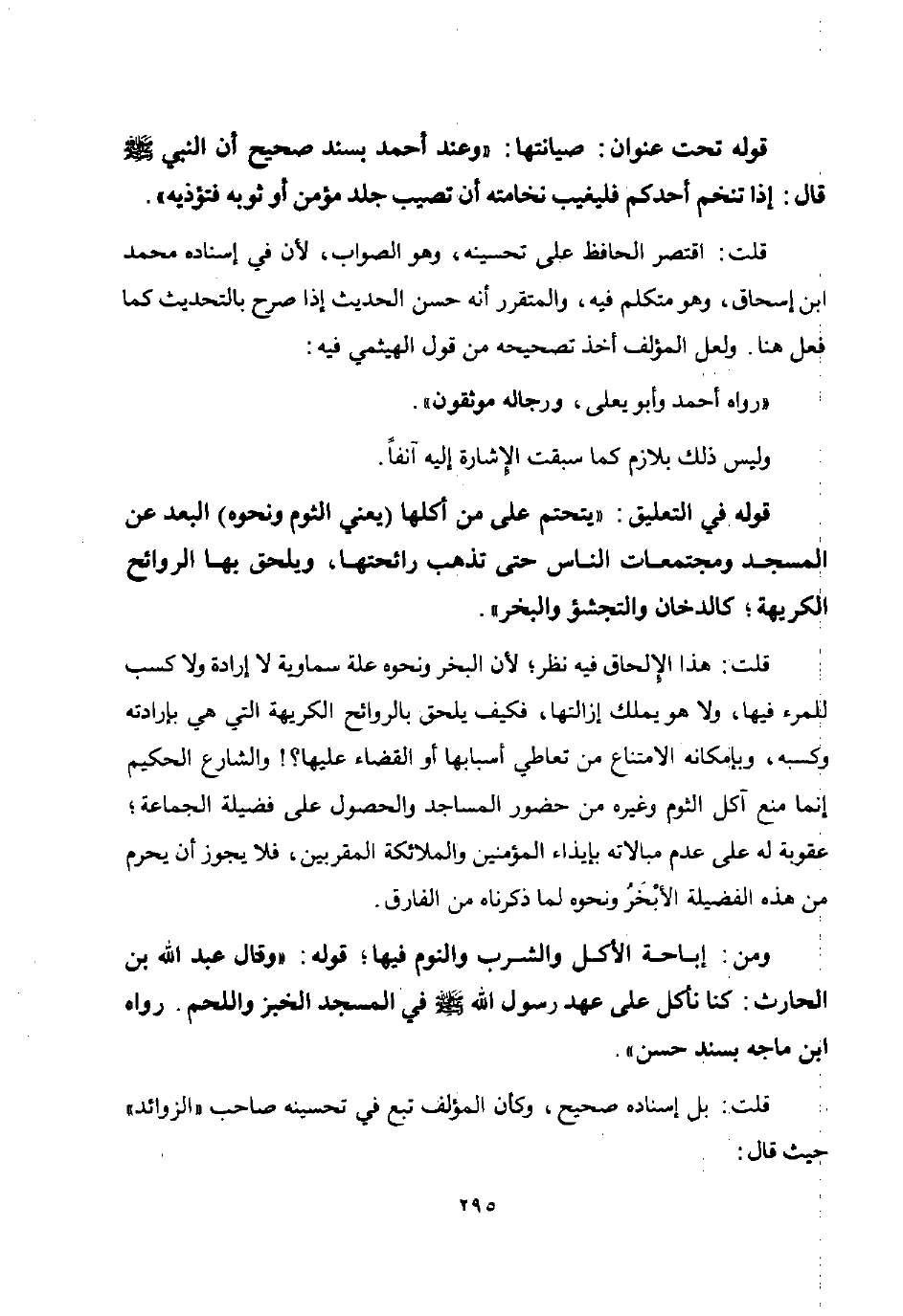 قوله تحت عنوان: صيانتها: وعند أحمد بسند صحيح أن النبي صلى الله عليه وسلم قال: "إذا تنخم أحدكم فليغيب نخامته أن تصيب جلد مؤمن أو ثوبه فتؤذيه".
