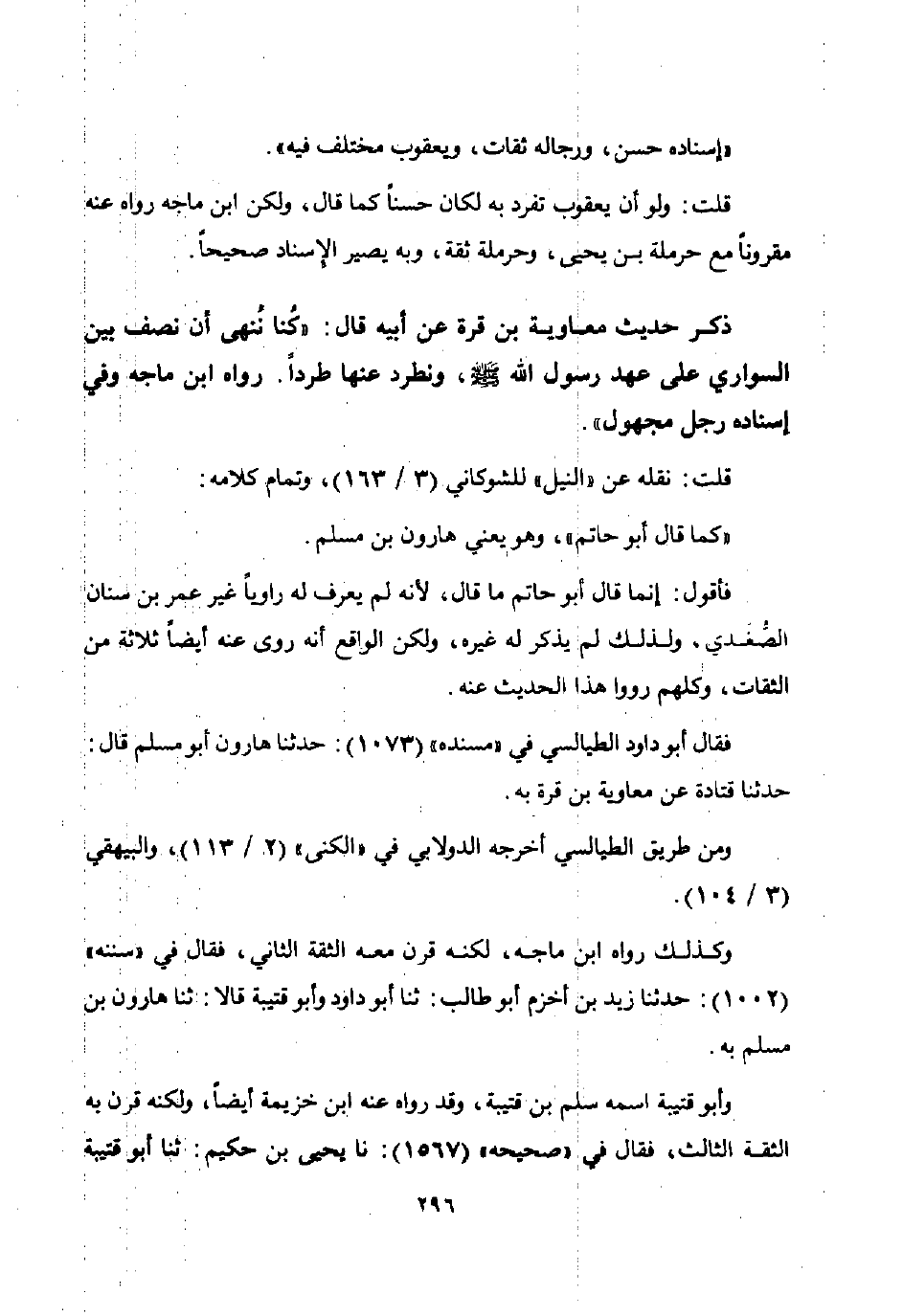 ذكر حديث معاوية بن قرة عن أبيه قال: "كنا ننهى أن نصف بين السواري على عهد رسول الله صلى الله عليه وسلم ونطرد عنها طردا. رواه ابن ماجه وفي إسناده رجل مجهول".