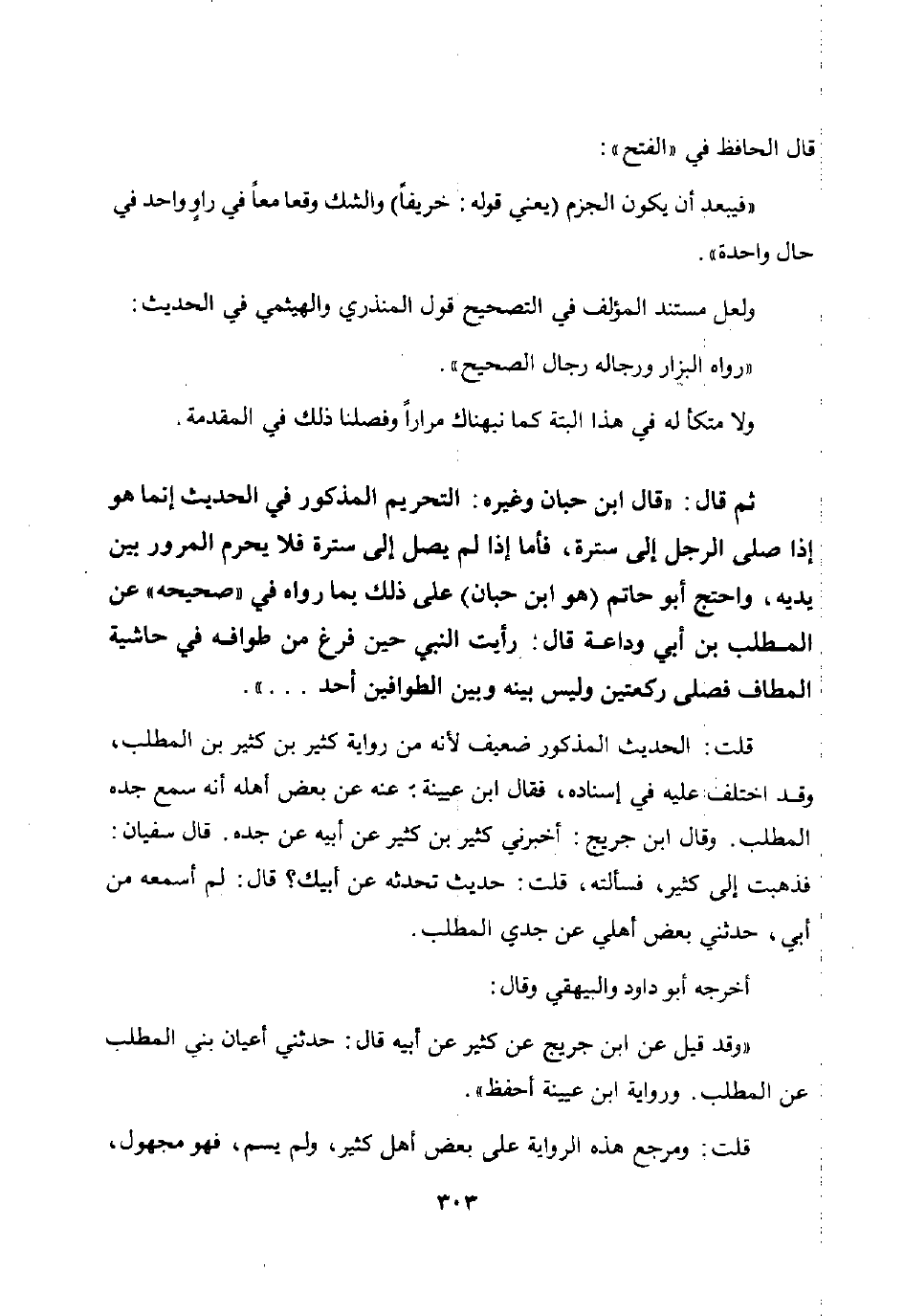 ثم قال: "قال ابن حبان وغيره: التحريم المذكور في الحديث إنما هو إذا صلى الرجل إلى سترة فأما إذا لم يصل إلى سترة فلا يحرم المرور بين يديه واحتج أبو حاتم هو ابن حبان على ذلك بما رواه في "صحيحه" عن المطلب بن أبي وداعة قال: رأيت النبي حين فرغ من طوافه في حاشية المطاف فصلى ركعتين وليس بينه وبين الطوافين أحد ... ".