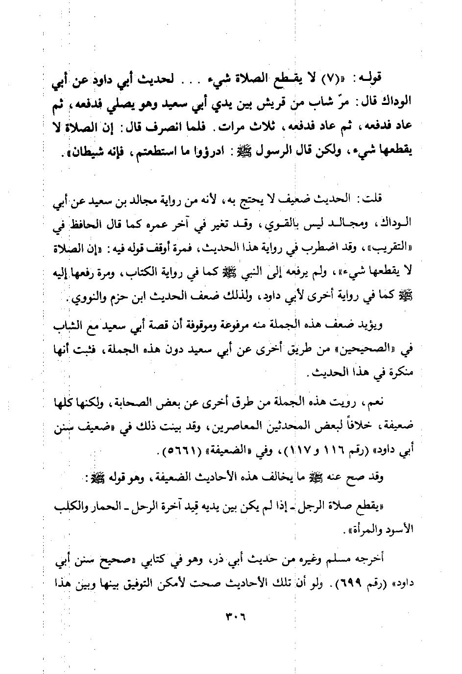 قلت: الحديث ضعيف لا يحتج به لأنه من رواية مجالد بن سعيد عن أبي الوداك ومجالد ليس بالقوي وقد تغير في آخر عمره كما قال الحافظ في "التقريب" وقد اضطرب في رواية هذا الحديث فمرة أوقف قوله فيه: "إن الصلاة لا يقطعها شيء" ولم يرفعه إلى النبي صلى الله عليه وسلم كما في رواية الكتاب ومرة رفعها إليه صلى الله عليه وسلم كما في رواية أخرى لأبي داود ولذلك ضعف الحديث ابن حزم والنووي.