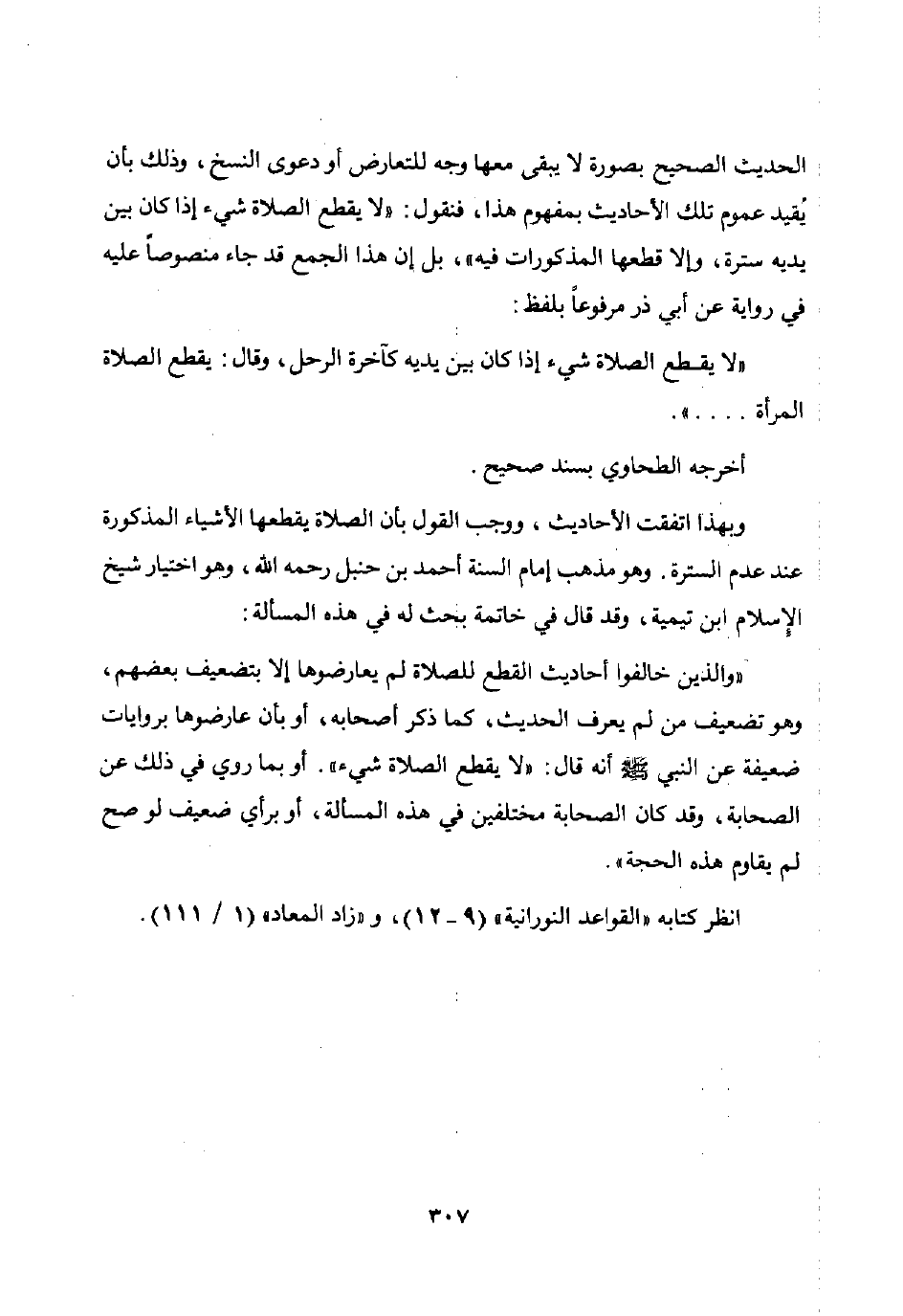وبهذا اتفقت الأحاديث ووجب القول بأن الصلاة يقطعها الأشياء المذكورة عند عدم السترة. وهو مذهب إمام السنة أحمد بن حنبل رحمه الله وهو اختيار شيخ الإسلام ابن تيمية وقد قال في خاتمة بحث له في هذه المسألة: