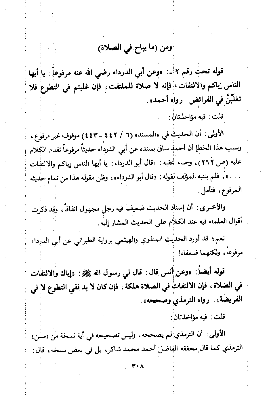 قوله تحت رقم 2 -: "وعن أبي الدرداء رضي الله عنه مرفوعا: يا أيها الناس إياكم والالتفات فإنه لا صلاة للملتفت فإن غلبتم في التطوع فلا تغلبن في الفرائض". رواه أحمد"
