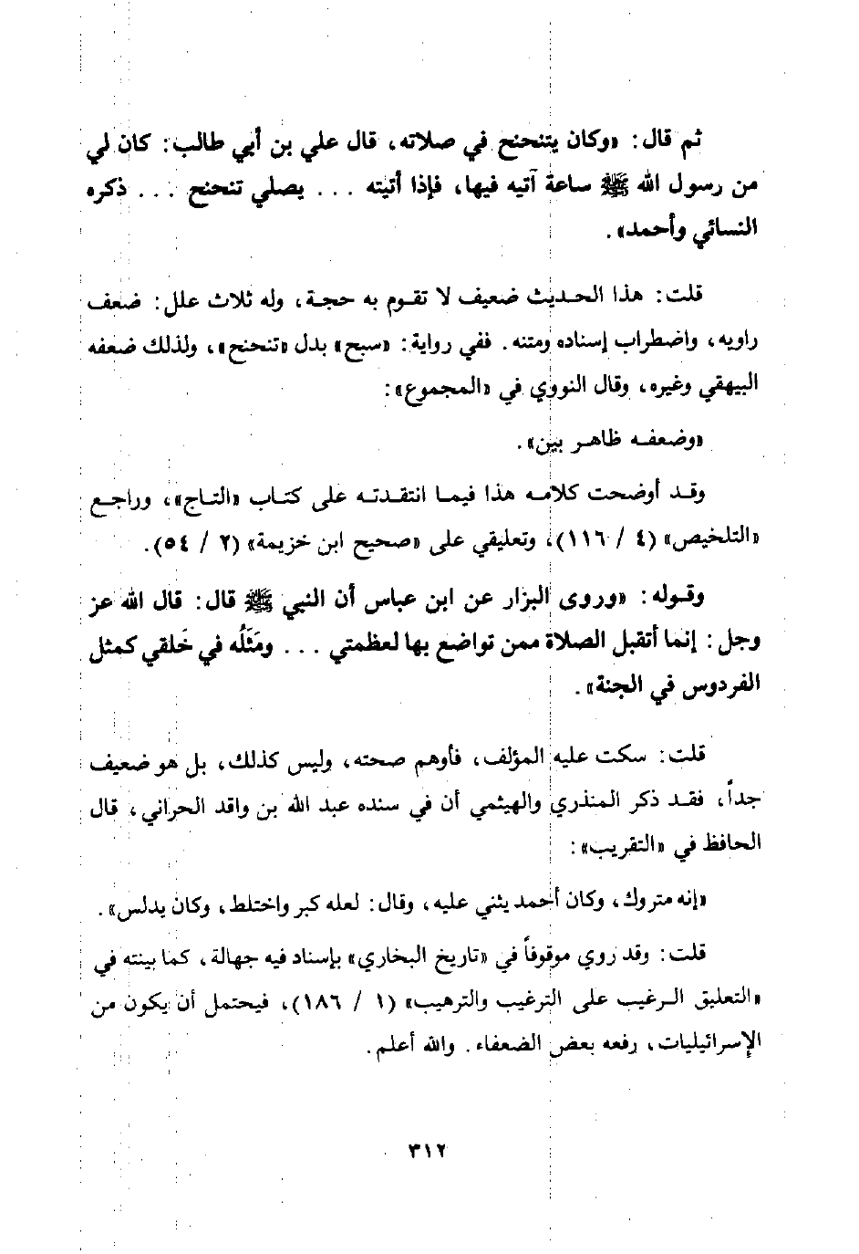 ثم قال: "وكان يتنحنح في صلاته قال علي بن أبي طالب: كان لي من رسول الله صلى الله عليه وسلم ساعة آتيه فيها فإذا أتيته ... يصلي تنحنح ... ذكره النسائي وأحمد".