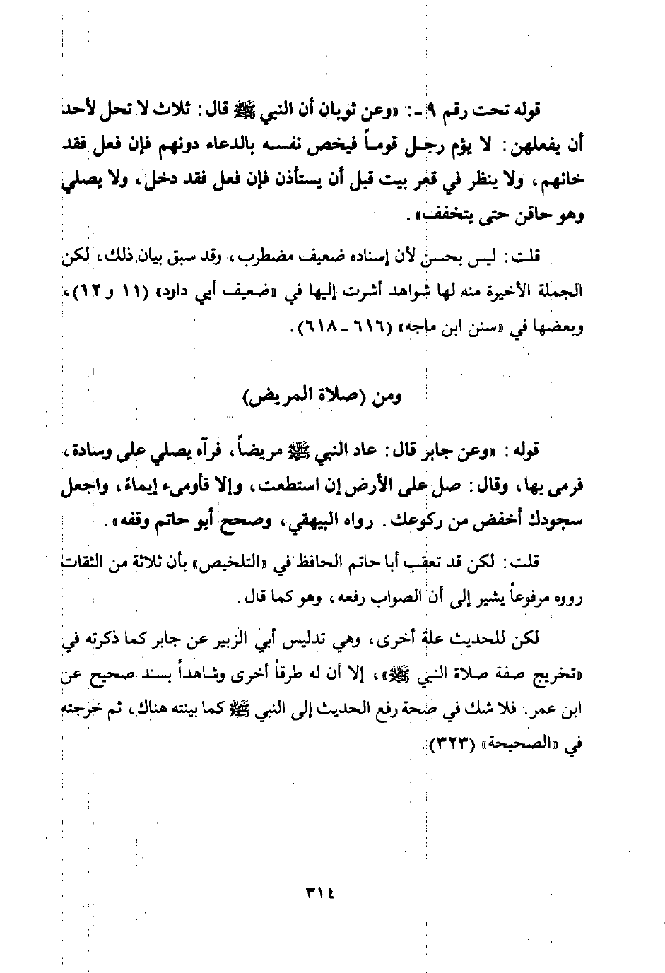 قوله تحت رقم 9 -: وعن ثوبان أن النبي صلى الله عليه وسلم قال: "ثلاث لا تحل لأحد أن يفعلهن: لا يؤم رجل قوما فيخص نفسه بالدعاء دونهم فإن فعل فقد خانهم ولا ينظر في قعر بيت قبل أن يستأذن فإن فعل فقد دخل ولا يصلي وهو حاقن حتى يتخفف".