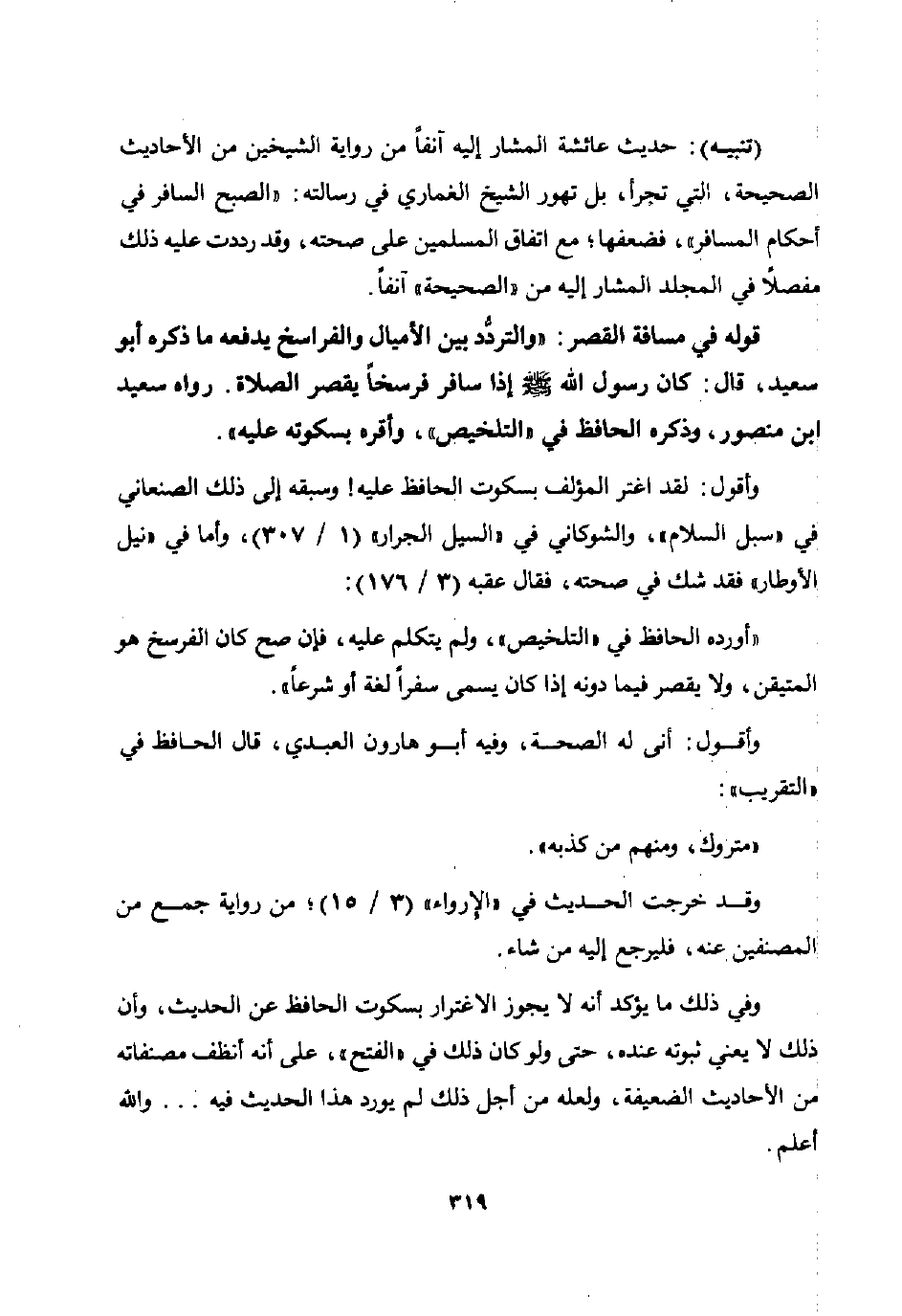 قوله في مسافة القصر: "والتردد بين الأميال والفراسخ يدفعه ما ذكره أبو سعيد قال: كان رسول الله صلى الله عليه وسلم إذا سافر فرسخا يقصر الصلاة. رواه سعيد ابن منصور وذكره الحافظ في "التلخيص" وأقره بسكوته عليه".