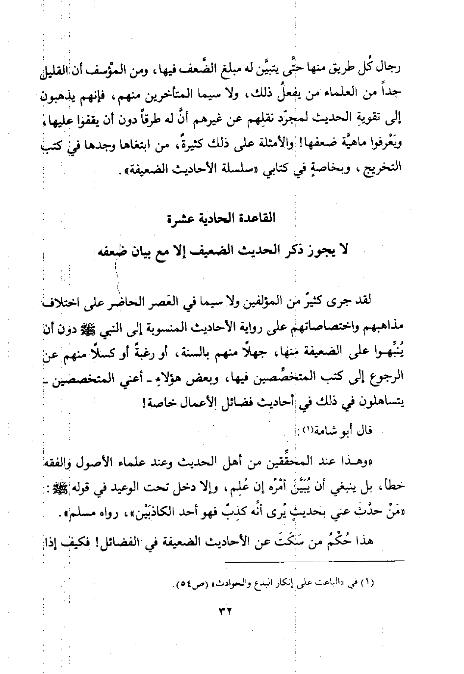 القاعدة الحادية عشرة لا يجوز ذكر الحديث الضعيف إلا مع بيان ضعفه