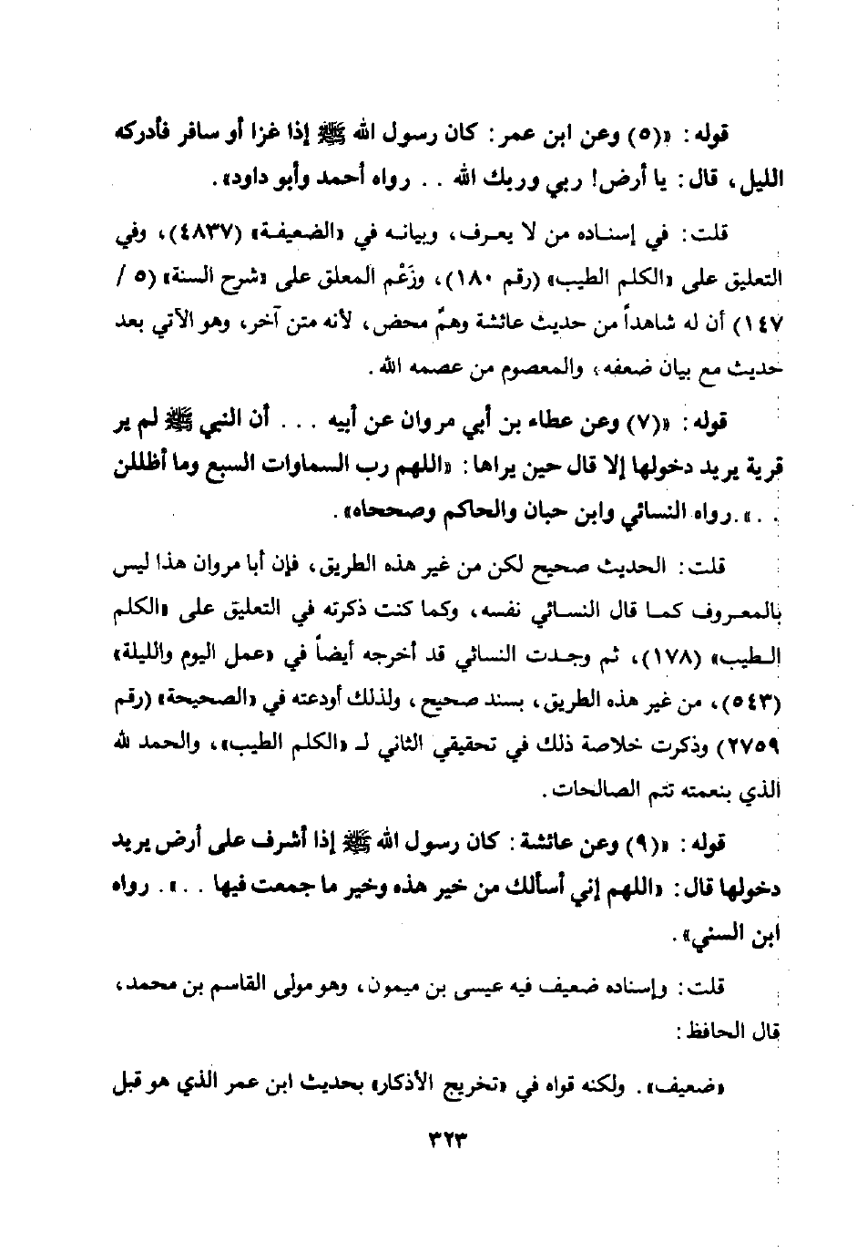 قوله: "9 وعن عائشة: كان رسول الله صلى الله عليه وسلم إذا أشرف على أرض يريد دخولها قال: "اللهم إني أسالك من خير هذه وخير ما جمعت فيها ... ". رواه ابن السني"
