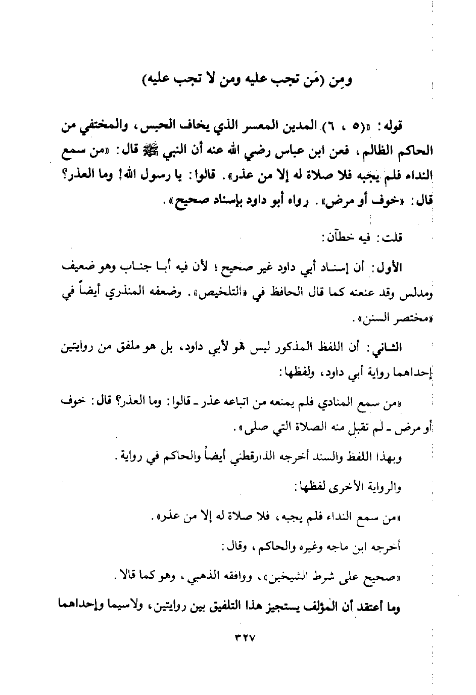 قوله:" 5, 6 المدين المعسر الذي يخاف الحبس والمختفي من الحكم الظالم فعن ابن عباس رضي الله عنه أن النبي صلى الله عليه وسلم قال: "من سمع النداء فلم يجبه فلا صلاة له إلا من عذر". قالوا: يا رسول الله وما العذر؟ قال: "خوف أو مرض". رواه أبو داود بإسناد صحيح".