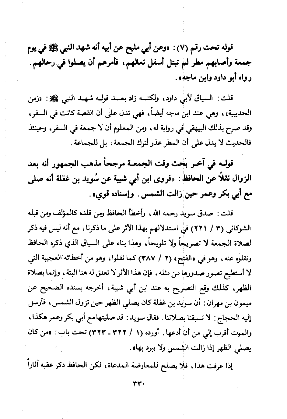 قوله في آخر بحث وقت الجمعة مرجحا مذهب الجمهور أنه بعد الزوال نقلا عن الحافظ: "فروى ابن أبي شيبة عن سويد بن غفلة أنه صلى مع أبي بكر وعمر حين زالت الشمس. وإسناده قوي".