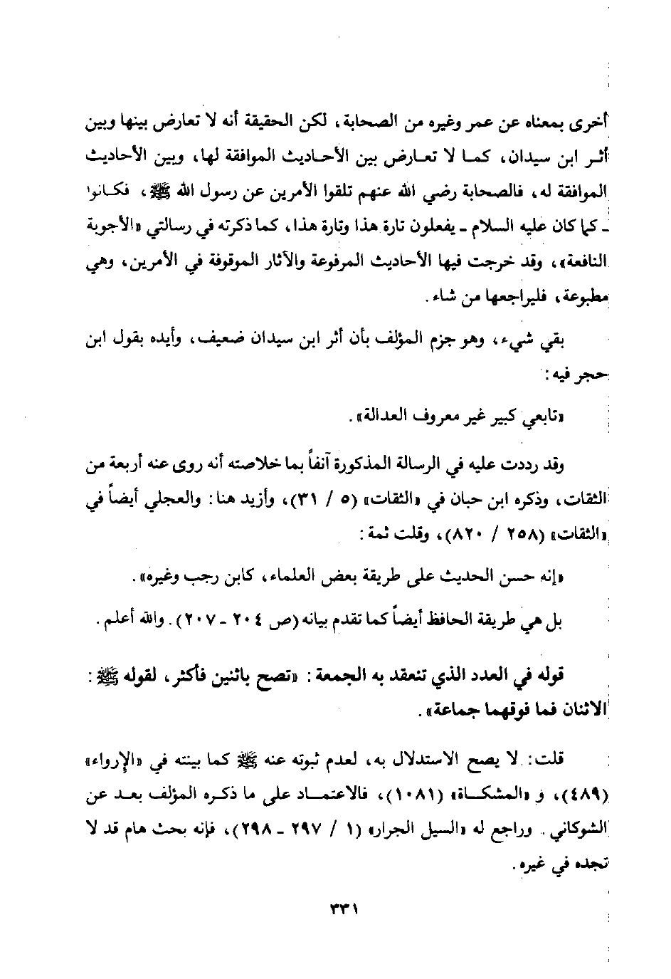 أخرى بمعناه عن عمر وغيره من الصحابة لكن الحقيقة أنه لا تعارض بينها وبين أثر ابن سيدان كما لا تعارض بين الأحاديث الموافقة لها وبين الأحاديث الموافقة له فالصحابة رضي الله عنهم تلقوا الأمرين عن رسول الله صلى الله عليه وسلم فكانوا - كما كان عليه السلام - يفعلون تارة هذا وتارة هذا كما ذكرته في رسالتي "الأجوبة النافعة" وقد خرجت فيها الأحاديث المرفوعة والآثار الموقوفة في الأمرين وهي مطبوعة فليراجعها من شاء.