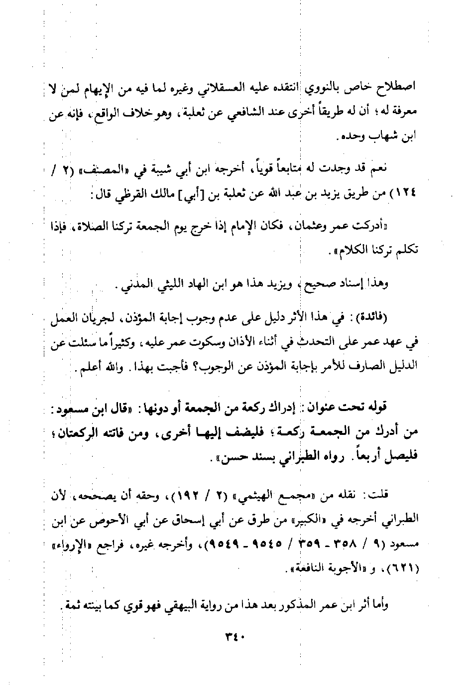 فائدة: في هذا الأثر دليل على عدم وجوب إجابة المؤذن لجريان العمل في عهد عمر على التحدث في أثناء الأذان وسكوت عمر عليه وكثيرا ما سئلت عن الدليل الصارف للأمر بإجابة المؤذن عن الوجوب؟ فأجبت بهذا. والله أعلم.