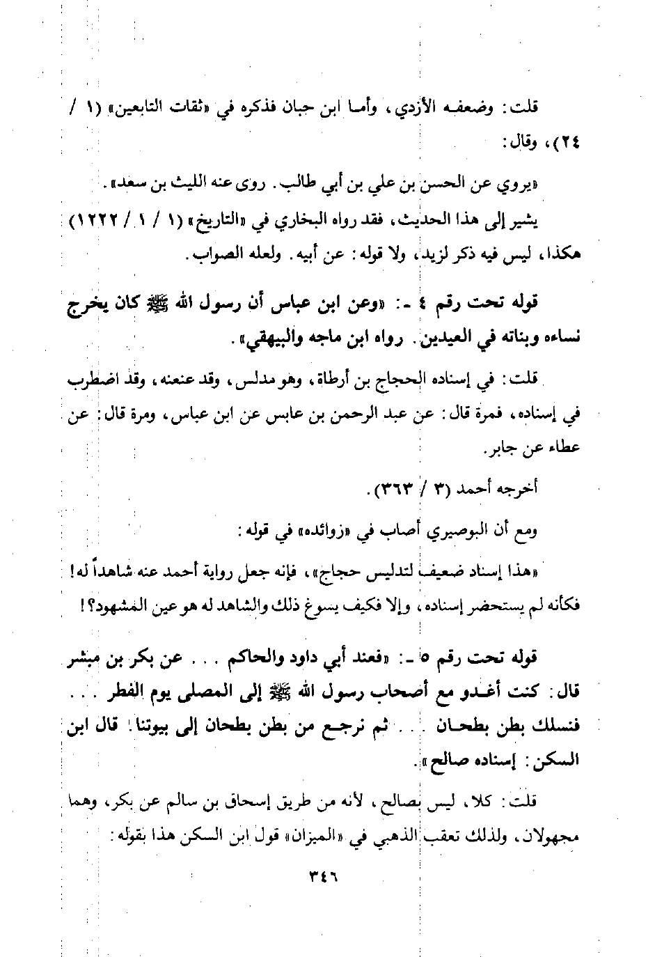 قوله تحت رقم 4 -: "وعن ابن عباس أن رسول الله صلى الله عليه وسلم كان يخرج نساءه وبناته في العيدين. رواه ابن ماجه والبيهقي".