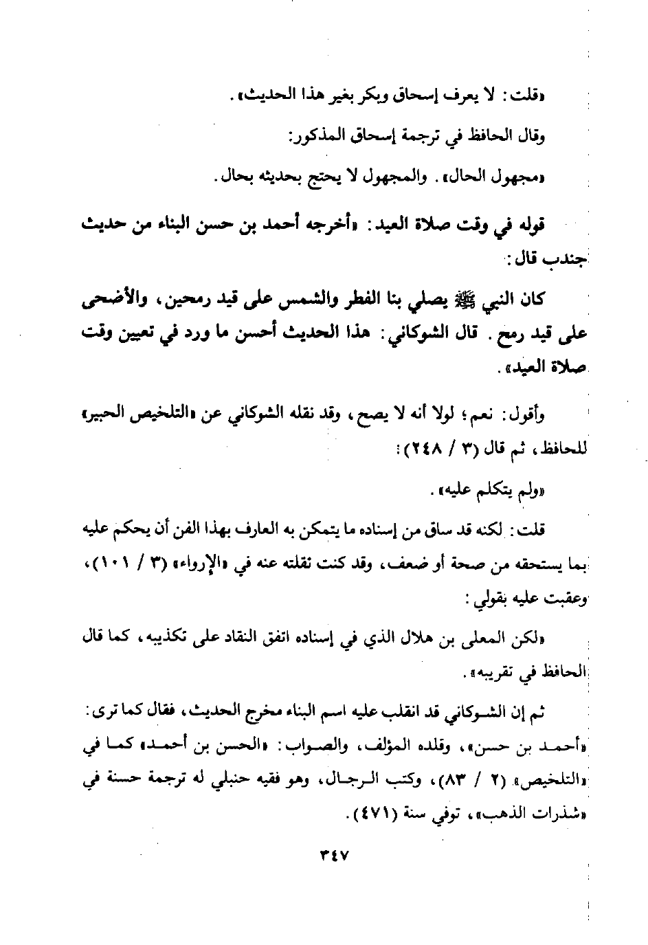 ثم إن الشوكاني قد انقلب عليه اسم البناء مخرج الحديث فقال كما ترى: "أحمد بن حسن" وقلده المؤلف والصواب: "الحسن بن أحمد" كما في "التلخيص" 2 / 83 وكتب الرجال وهو فقيه حنبلي له ترجمة حسنة في "شذرات الذهب" توفي سنة 471.