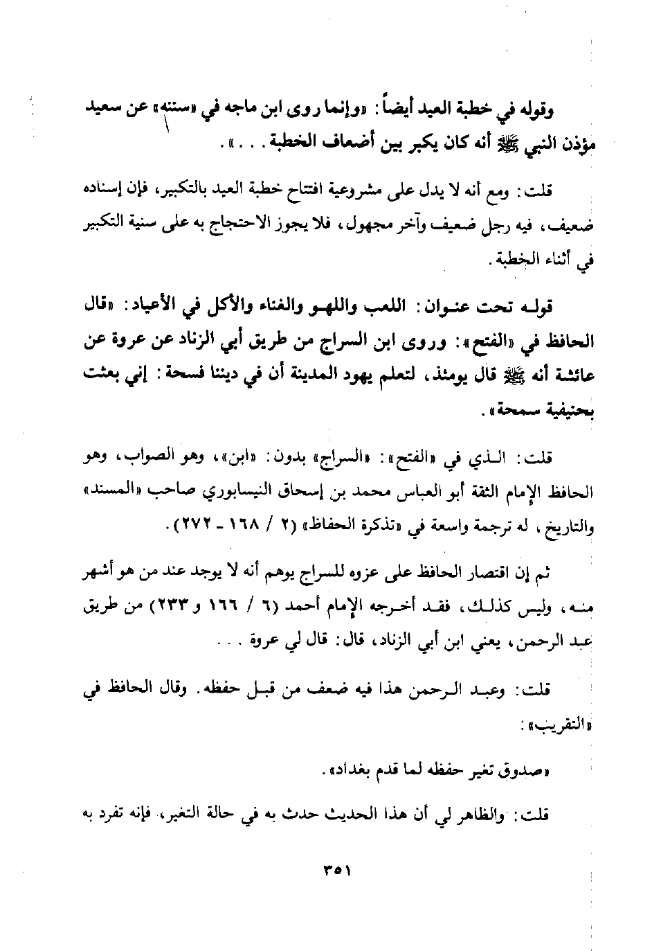 قلت: الذي في "الفتح ": "السراج" بدون: "ابن" وهو الصواب وهو الحافظ الإمام الثقة أبو العباس محمد بن إسحاق النيسابوري صاحب "المسند" والتاريخ له ترجمة واسعة في "تذكرة الحفاظ" 2 / 168 – 272.