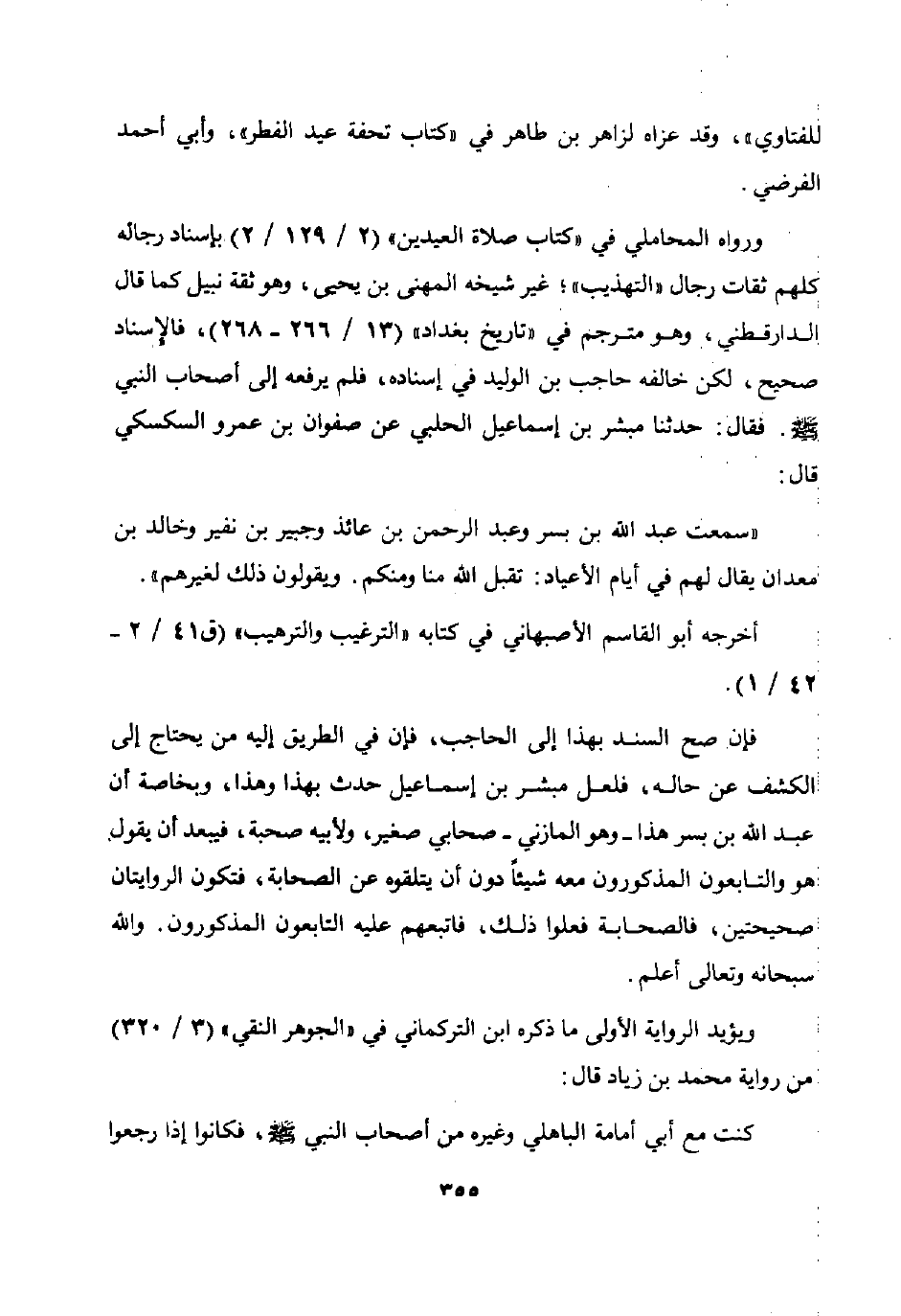 "سمعت عبد الله بن بسرو عبد الرحمن بن عائذ وجبير بن نفير وخالد بن معدان يقال لهم في أيام الأعياد: تقبل الله منا ومنكم. ويقولون ذلك لغيرهم".