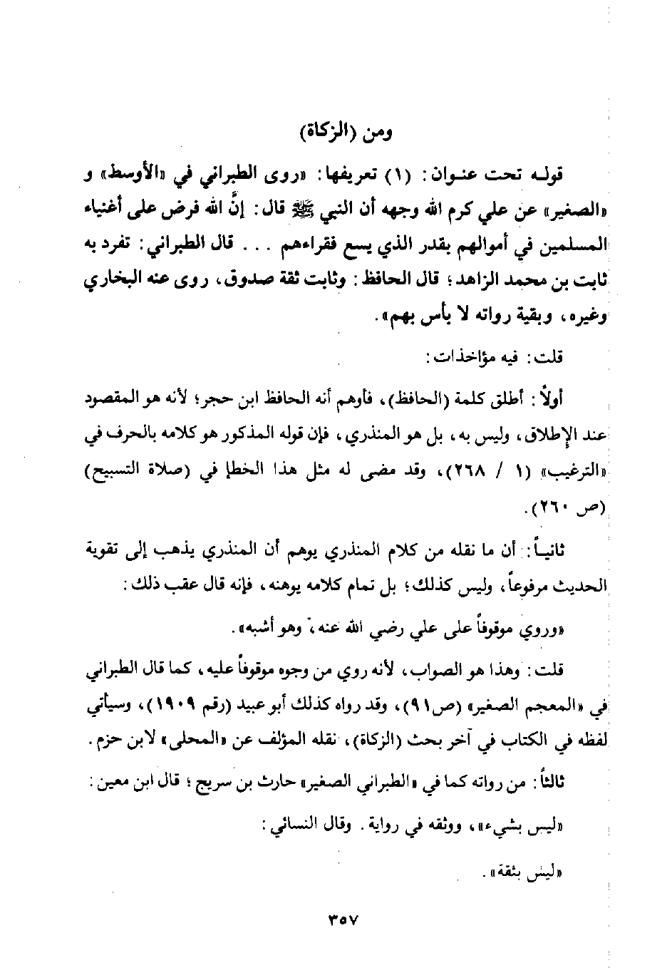 قوله تحت عنوان: 1 تعريفها: "روى الطبراني في "الأوسط" و "الصغير" عن علي كرم الله وجهه أن النبي صلى الله عليه وسلم قال: "إن الله فرض على أغنياء المسلمين في أموالهم بقدر الذي يسع فقراءهم ... " قال الطبراني: تفرد به ثابت بن محمد الزاهد: قال الحافظ: وثابت ثقة صدوق روى عنه البخاري وغيره وبقية رواته لا بأس بهم".