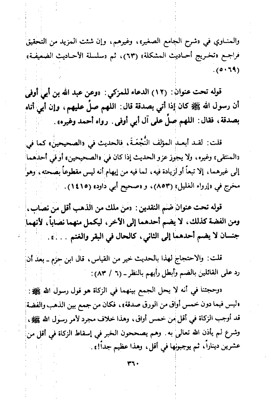 قوله تحت عنوان: 12 الدعاء للمزكي: "وعن عبد الله بن أبي أوفى أن رسول الله صلى الله عليه وسلم كان إذا أتي بصدقة قال: "اللهم صل عليهم" وإن أبي أتاه بصدقة فقال: "اللهم صل على آل أبي أوفى". رواه أحمد وغيره".