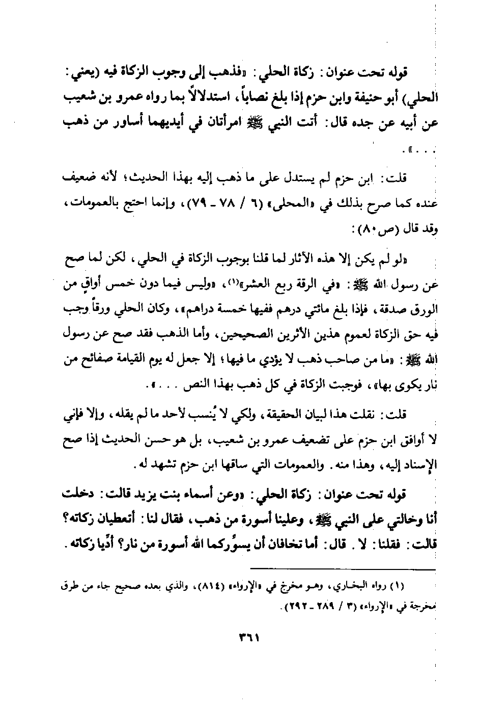 قوله تحت عنوان: زكاة الحلي: "وعن أسماء بنت يزيد قالت: دخلت أنا وخالتي على النبي صلى الله عليه وسلم وعلينا أسورة من ذهب فقال لنا: "أتعطيان زكاته؟ " قالت: فقلنا: لا. قال: "أما تخافان أن يسوركما الله أسورة من نار؟ أديا زكاته".