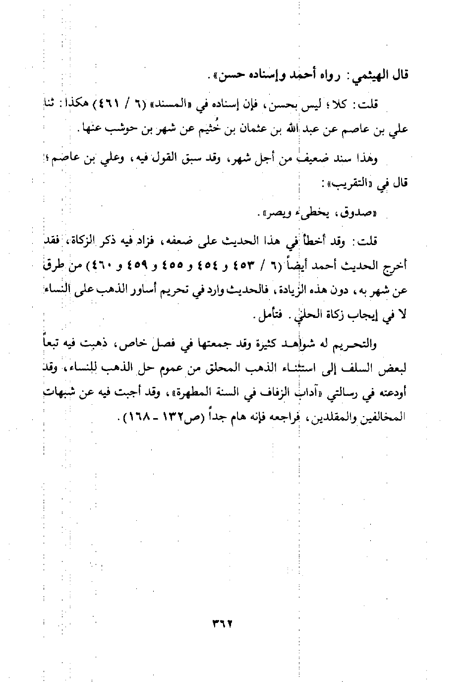 قلت: وقد أخطأ في هذا الحديث على ضعفه فزاد فيه ذكر الزكاة فقد أخرج الحديث أحمد أيضا 6 / 453 و454 و455 و459 و460 من طرق عن شهر به دون هذه الزيادة فالحديث وارد في تحريم أساور الذهب على النساء لا في إيجاب زكاة الحلي. فتأمل.