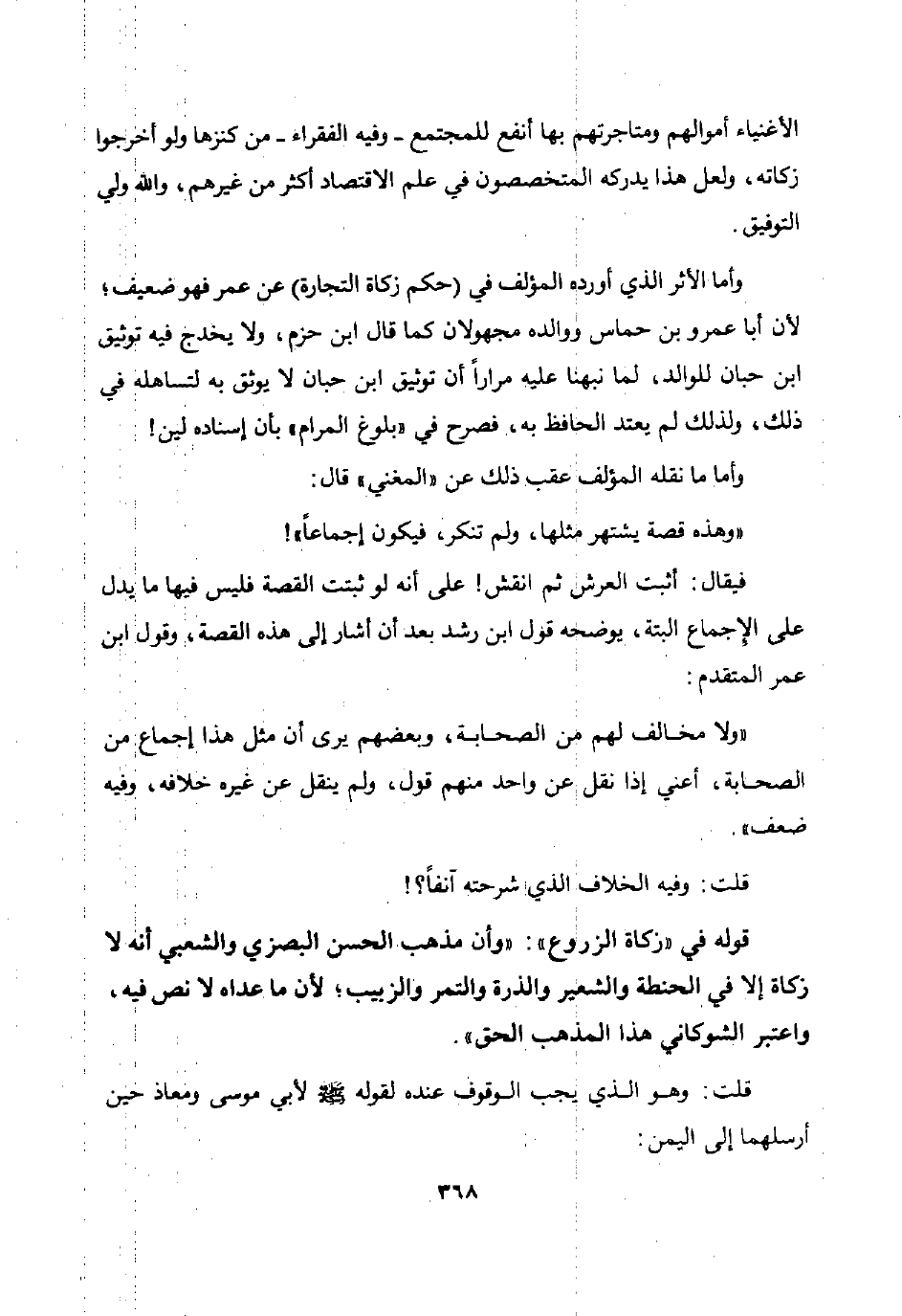 وأما الأثر الذي أورده المؤلف في حكم زكاة التجارة عن عمر فهو ضعيف لأن أبا عمرو بن حماس ووالده مجهولان كما قال ابن حزم ولا يخدج فيه توثيق ابن حبان للوالد لما نبهنا عليه مرارا أن توثيق ابن حبان لا يوثق به لتساهله في ذلك ولذلك لم يعتد الحافظ به فصرح في "بلوغ المرام" بأن إسناده لين!