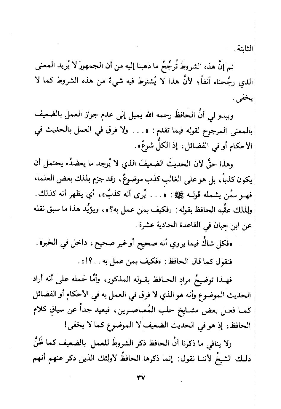 ولا ينافي ما ذكرنا أن الحافظ ذكر الشروط للعمل بالضعيف كما ظن ذلك الشيخ لأننا نقول: إنما ذكرها الحافظ لأولئك الذين ذكر عنهم أنهم