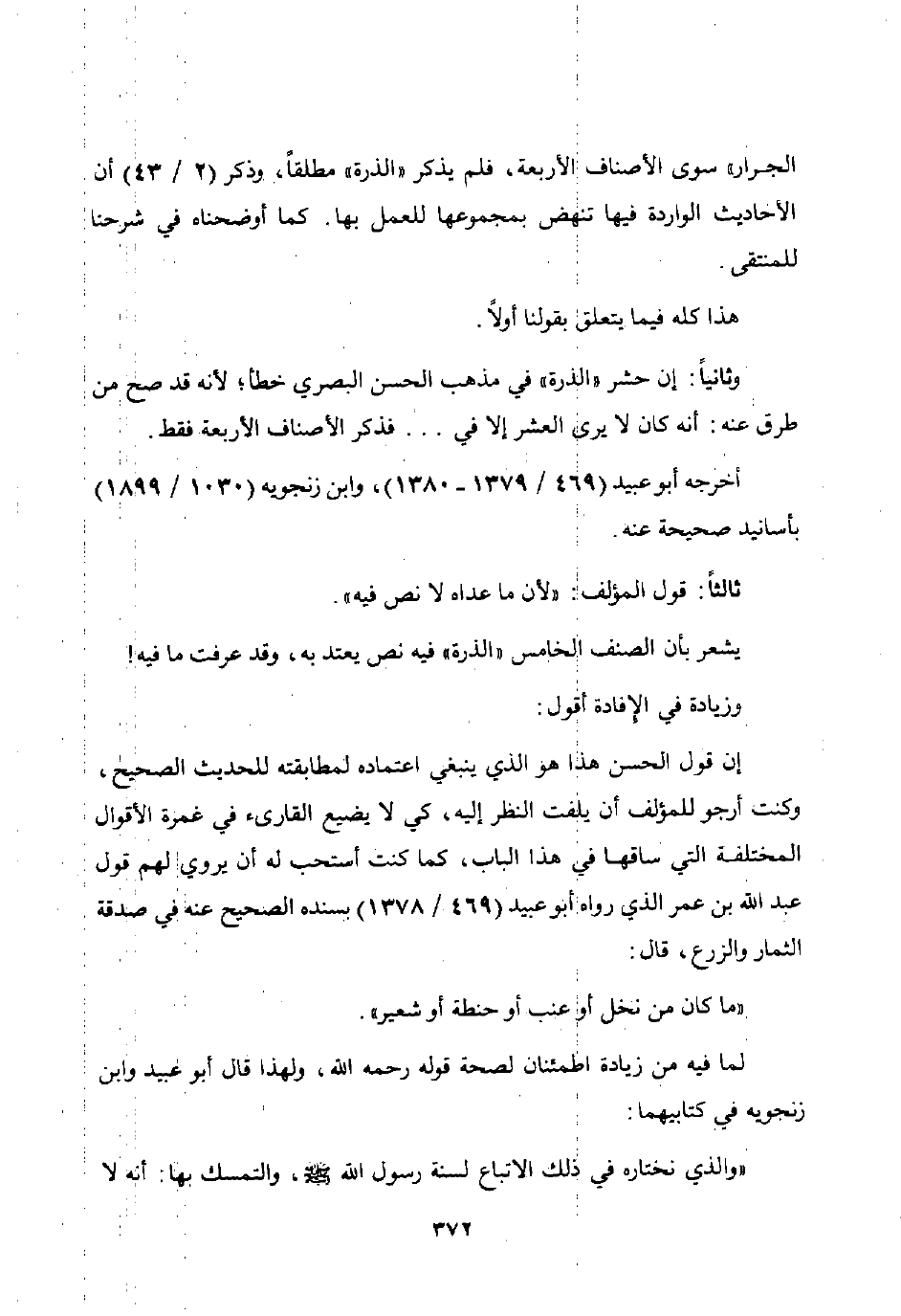 إن قول الحسن هذا هو الذي ينبغي اعتماده لمطابقته للحديث الصحيح وكنت أرجو للمؤلف أن يلفت النظر إليه كي لا يضيع القارئ في غمرة الأقوال المختلفة التي ساقها في هذا الباب كما كنت أستحب له أن يروي لهم قول عبد الله بن عمر الذي رواه أبو عبيد 469 / 1378 بسنده الصحيح عنه في صدقة الثمار والزرع قال: