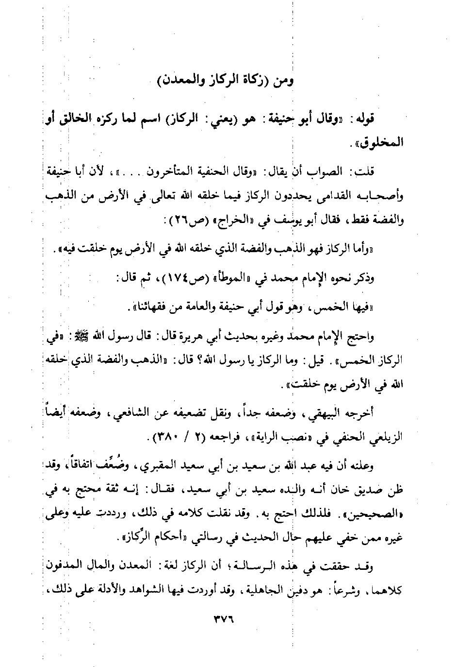 قلت: الصواب أن يقال: "وقال الحنفية المتأخرون ... " لأن أبا حنيفة وأصحابه القدامى يحددون الركاز فيما خلقه الله تعالى في الأرض من الذهب والفضة فقط فقال أبو يوسف في "الخراج" ص 26:
