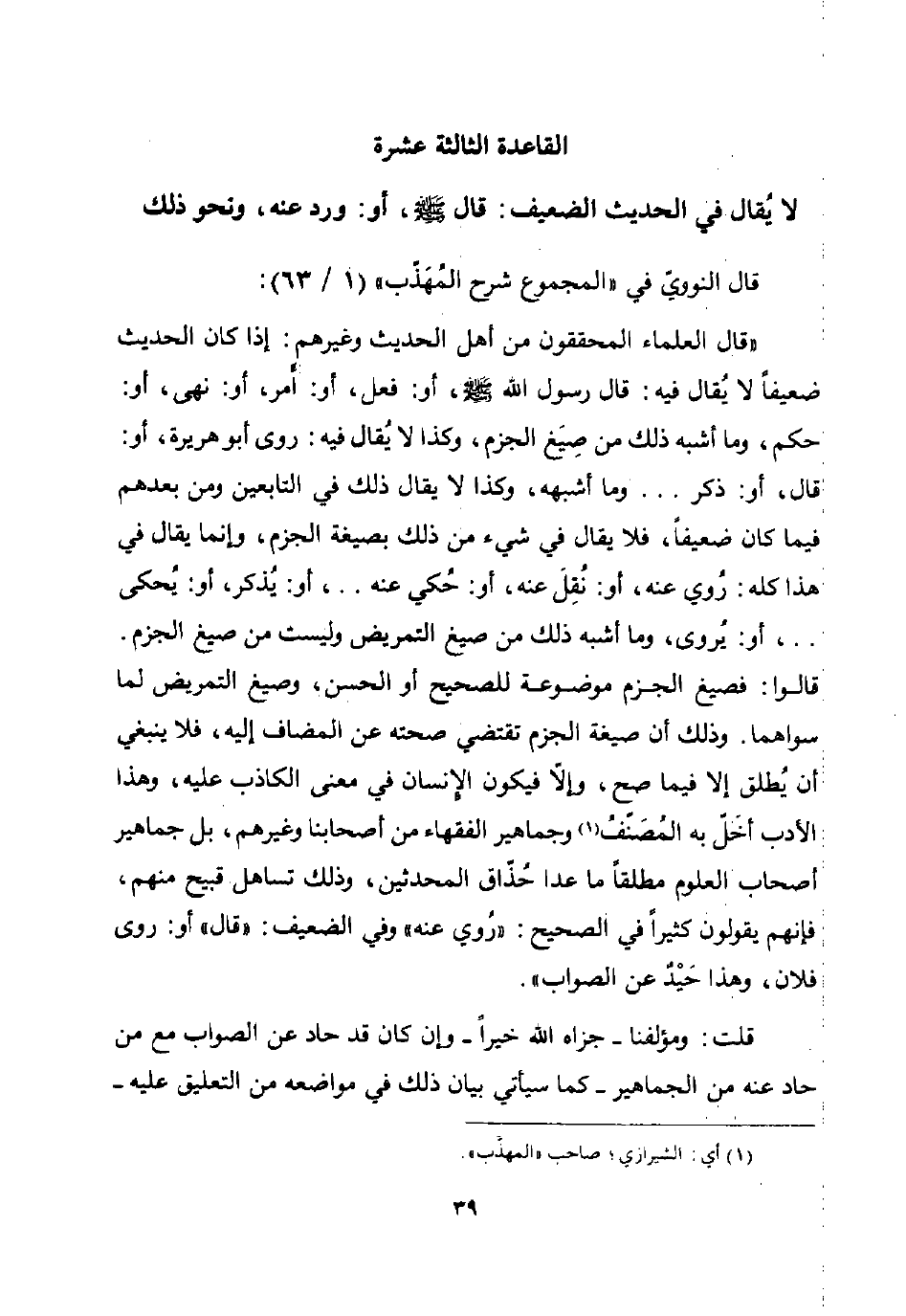 "قال العلماء المحققون من أهل الحديث وغيرهم: إذا كان الحديث ضعيفا لا يقال فيه: قال رسول الله صلى الله عليه وسلم أو: فعل أو: أمر أو: نهى أو: حكم وما أشبه ذلك من صيغ الجزم وكذا لا يقال فيه: روى أبو هريرة أو: قال أو: ذكر ... وما أشبهه وكذا لا يقال ذلك في التابعين ومن بعدهم فيما كان ضعيفا فلا يقال في شيء من ذلك بصيغة الجزم وإنما يقال في هذا كله: روي عنه أو: نقل عنه أو: حكي عنه ... أو: يذكر أو: يحكى ... أو: يروى وما أشبه ذلك من صيغ التمريض وليست من صيغ الجزم. قالوا: فصيغ الجزم موضوعة للصحيح أو الحسن وصيغ التمريض لما سواهما. وذلك أن صيغة الجزم تقتضي صحته عن المضاف إليه فلا ينبغي أن يطلق إلا فيما صح وإلا فيكون الإنسان في معنى الكاذب عليه وهذا الأدب أخل به المصنف1 وجماهير الفقهاء من أصحابنا وغيرهم بل جماهير أصحاب العلوم مطلقا ما عدا حذاق المحدثين وذلك تساهل قبيح منهم فإنهم يقولون كثيرا في الصحيح: "روي عنه" وفي الضعيف: "قال" أو: روى فلان وهذا حيد عن الصواب".