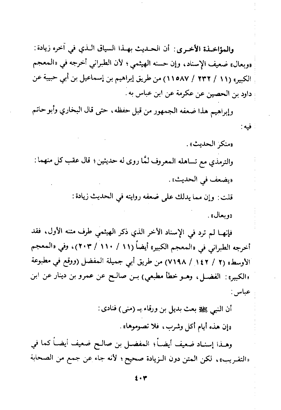 والمؤاخذة الأخرى: أن الحديث بهذا السياق الذي في آخره زيادة: "وبعال" ضعيف الإسناد وإن حسنه الهيثمي لأن الطبراني أخرجه في "المعجم الكبير" 11 / 232 / 1587 من طريق إبراهيم بن إسماعيل بن أبي حبيبة عن داود بن الحصين عن عكرمة عن ابن عباس به.