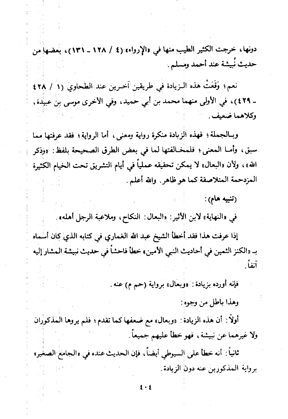 وبالجملة فهذه الزيادة منكرة رواية ومعنى أما الرواية؟ فقد عرفتها مما سبق وأما المعنى فلمخالفتها لما في بعض الطرق الصحيحة بلفظ: "وذكر الله" ولأن "البعال" لا يمكن تحقيقه عمليا في أيام التشريق تحت الخيام الكثيرة المزدحمة المتلاصقة كما هو ظاهر. والله أعلم.