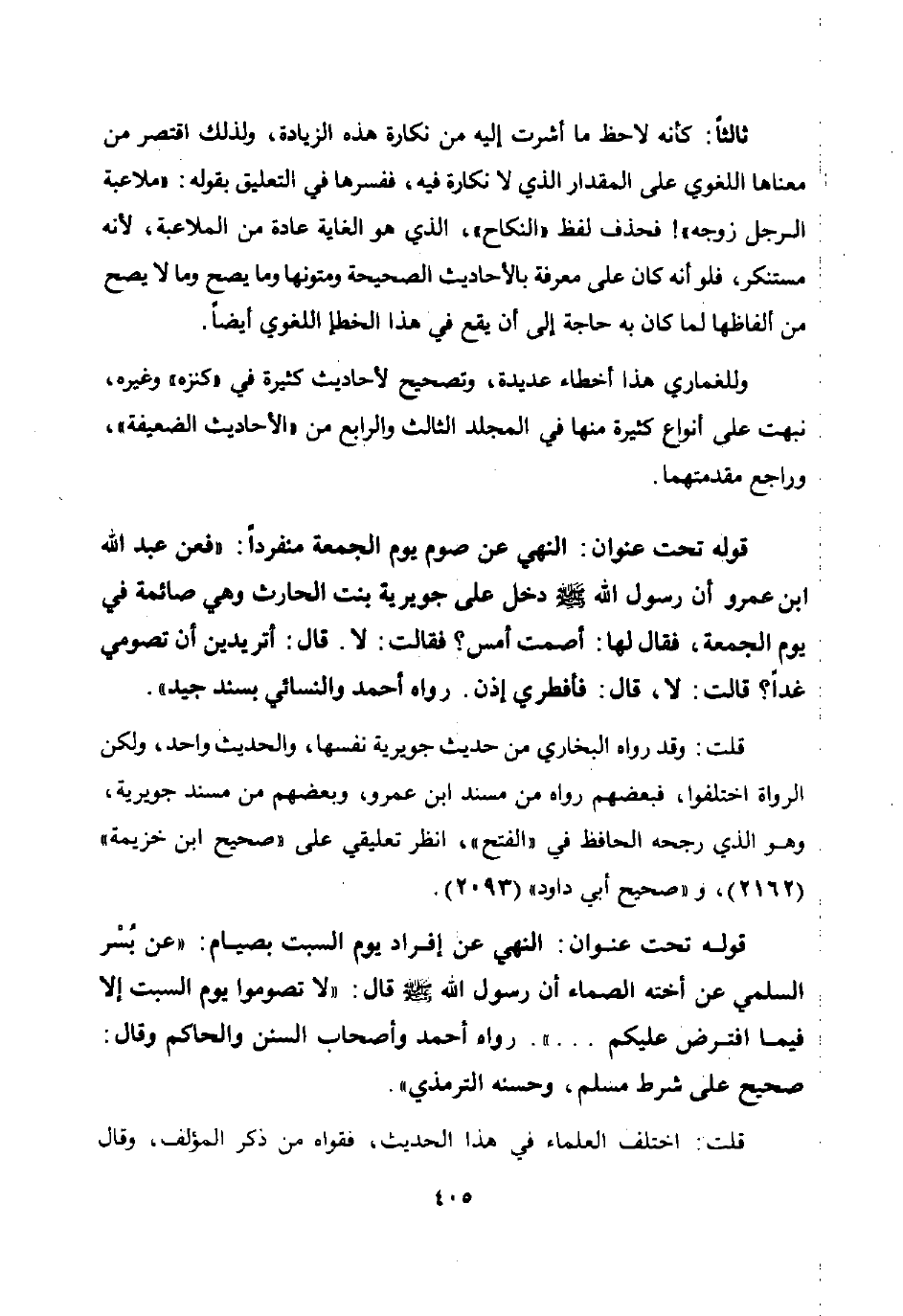 قوله تحت عنوان: النهي عن صوم يوم الجمعة منفردا: "فعن عبد الله ابن عمرو أن رسول الله صلى الله عليه وسلم دخل على جويرية بنت الحارث وهي صائمة في يوم الجمعة فقال لها: "أصمت أمس؟ " فقالت: لا