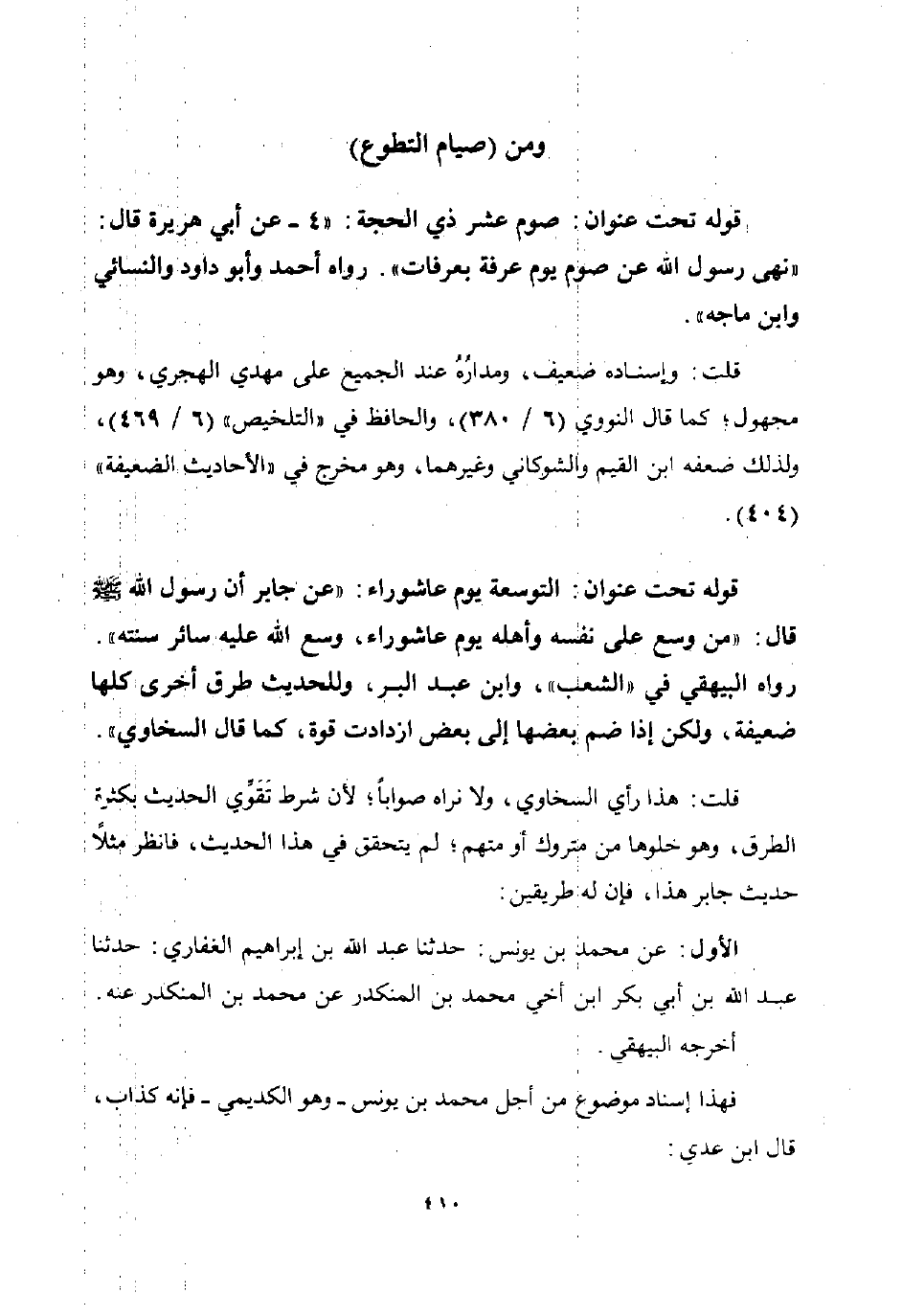 قوله تحت عنوان: صوم عشر ذي الحجة: "4 - عن أبي هريرة قال: "نهى رسول الله عن صوم يوم عرفة بعرفات". رواه أحمد وأبو داود والنسائي وابن ماجه".