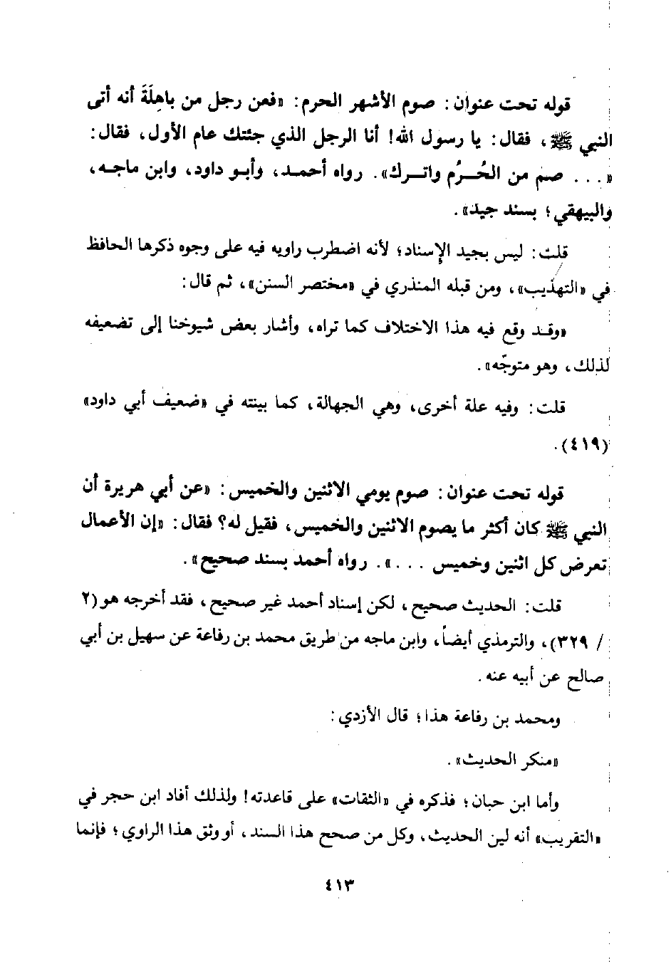 قوله تحت عنوان: صوم يومي الاثنين والخميس: "عن أبي هريرة أن النبي صلى الله عليه وسلم كان أكثر ما يصوم الاثنين والخميس فقيل له؟ فقال: "إن الأعمال تعرض كل اثنين وخميس ... ". رواه أحمد بسند صحيح".