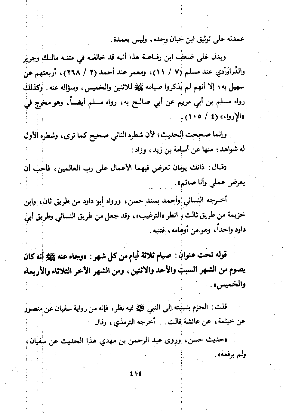 قوله تحت عنوان: صيام ثلاثة أيام من كل شهر: "وجاء عنه صلى الله عليه وسلم أنه كان يصوم من الشهر السبت والأحد والاثنين ومن الشهر الآخر الثلاثاء والأربعاء والخميس".