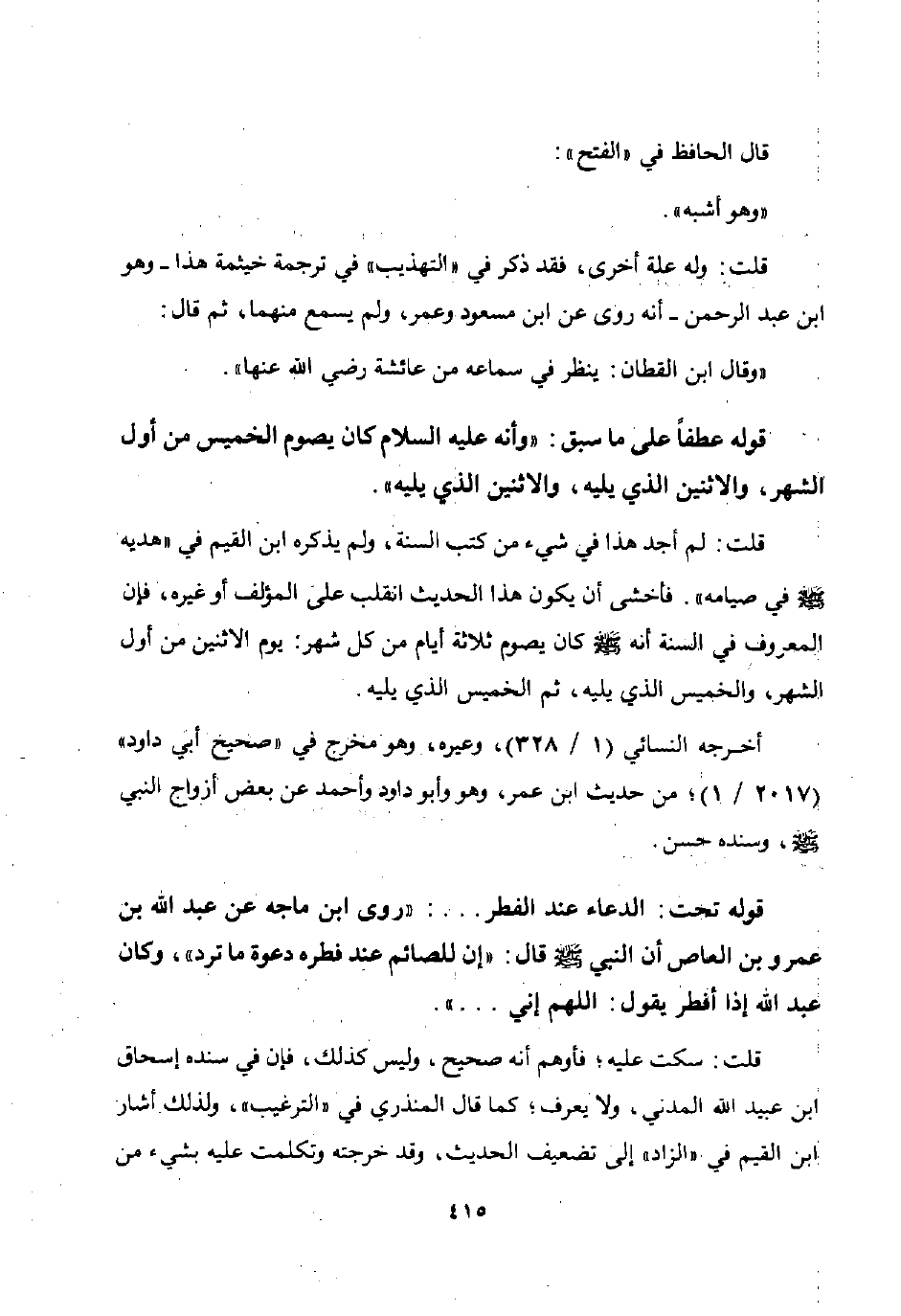 قوله تحت: الدعاء عند الفطر ... : "روى ابن ماجه عن عبد الله بن عمرو بن العاص أن النبي صلى الله عليه وسلم قال: "إن للصائم عند فطره دعوة ما ترد" وكان عبد الله إذا أفطر يقول: اللهم إني ... ".