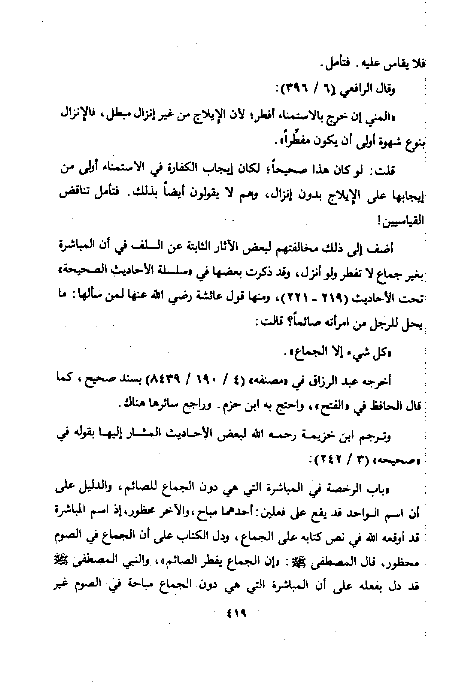 أضف إلى ذلك مخالفتهم لبعض الآثار الثابتة عن السلف في أن المباشرة بغير جماع لا تفطر ولو أنزل وقد ذكرت بعضها في "سلسلة الأحاديث الصحيحة" تحت الأحاديث 219 - 221 ومنها قول عائشة رضي الله عنها لمن سألها: ما يحل للرجل من امرأته صائما؟ قالت: