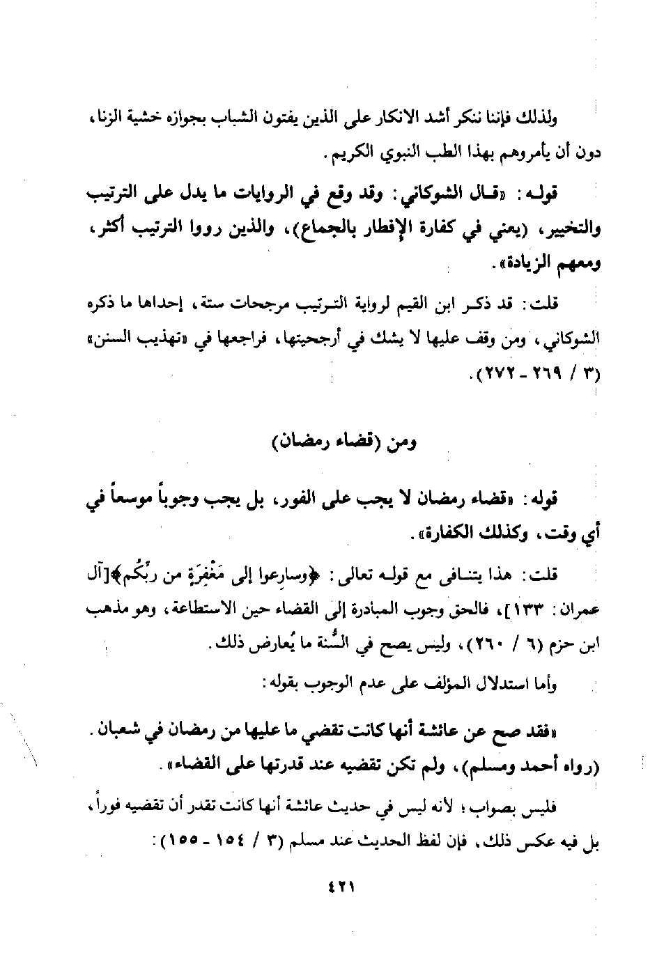 قلت: هذا يتنافى مع قوله تعالى: {وَسَارِعُوا إِلَى مَغْفِرَةٍ مِنْ رَبِّكُمْ} [آل عمران: 133] فالحق وجوب المبادرة إلى القضاء حين الاستطاعة وهو مذهب ابن حزم 6 / 260 وليس يصح في السنة ما يعارض ذلك.
