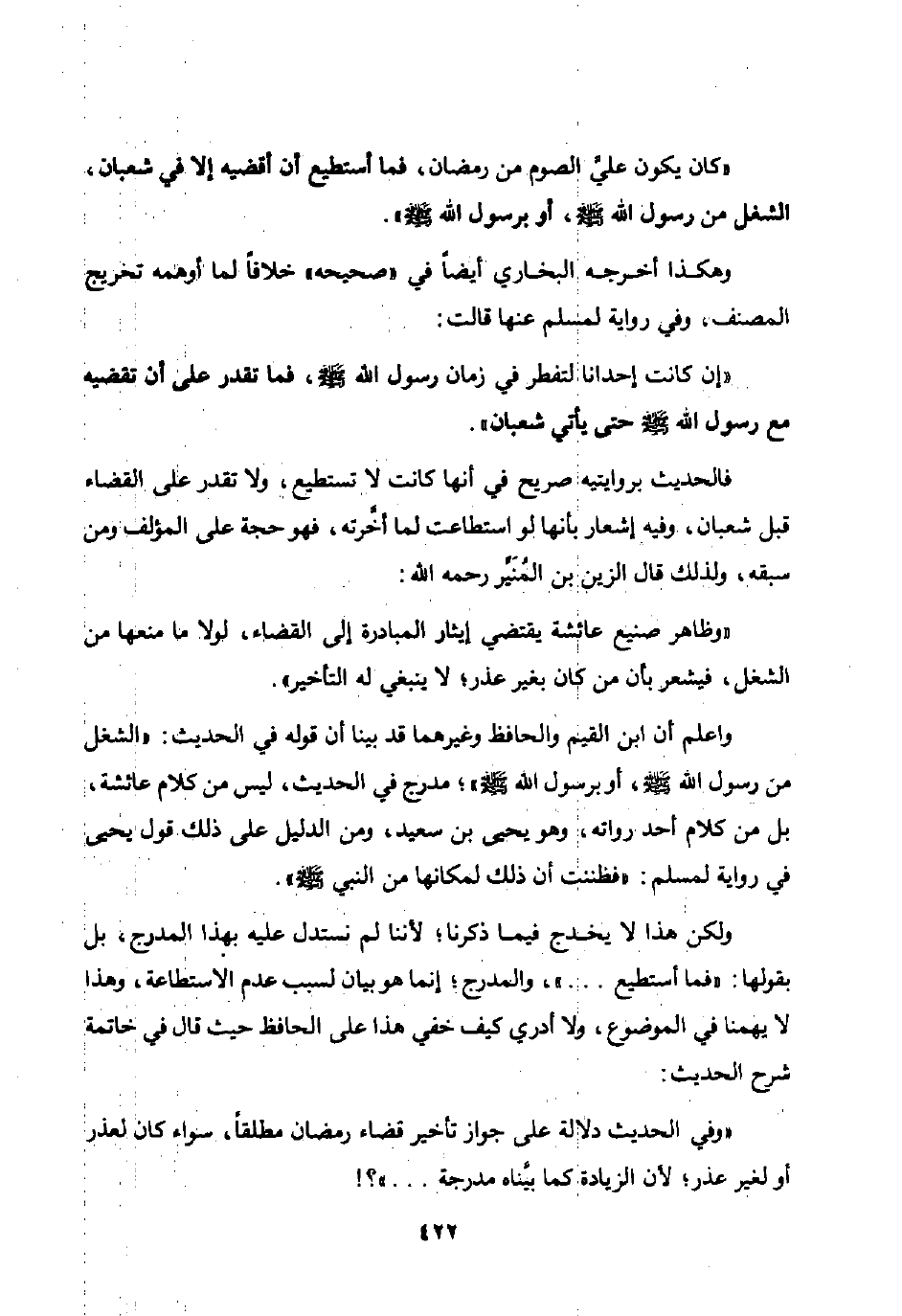 واعلم أن ابن القيم والحافظ وغيرهما قد بينا أن قوله في الحديث: "الشغل من رسول الله صلى الله عليه وسلم أو برسول الله صلى الله عليه وسلم مدرج في الحديث ليس من كلام عائشة بل من كلام أحد رواته وهو يحيى بن سعيد ومن الدليل على ذلك قول يحيى في رواية لمسلم: "فظننت أن ذلك لمكانها من النبي صلى الله عليه وسلم".