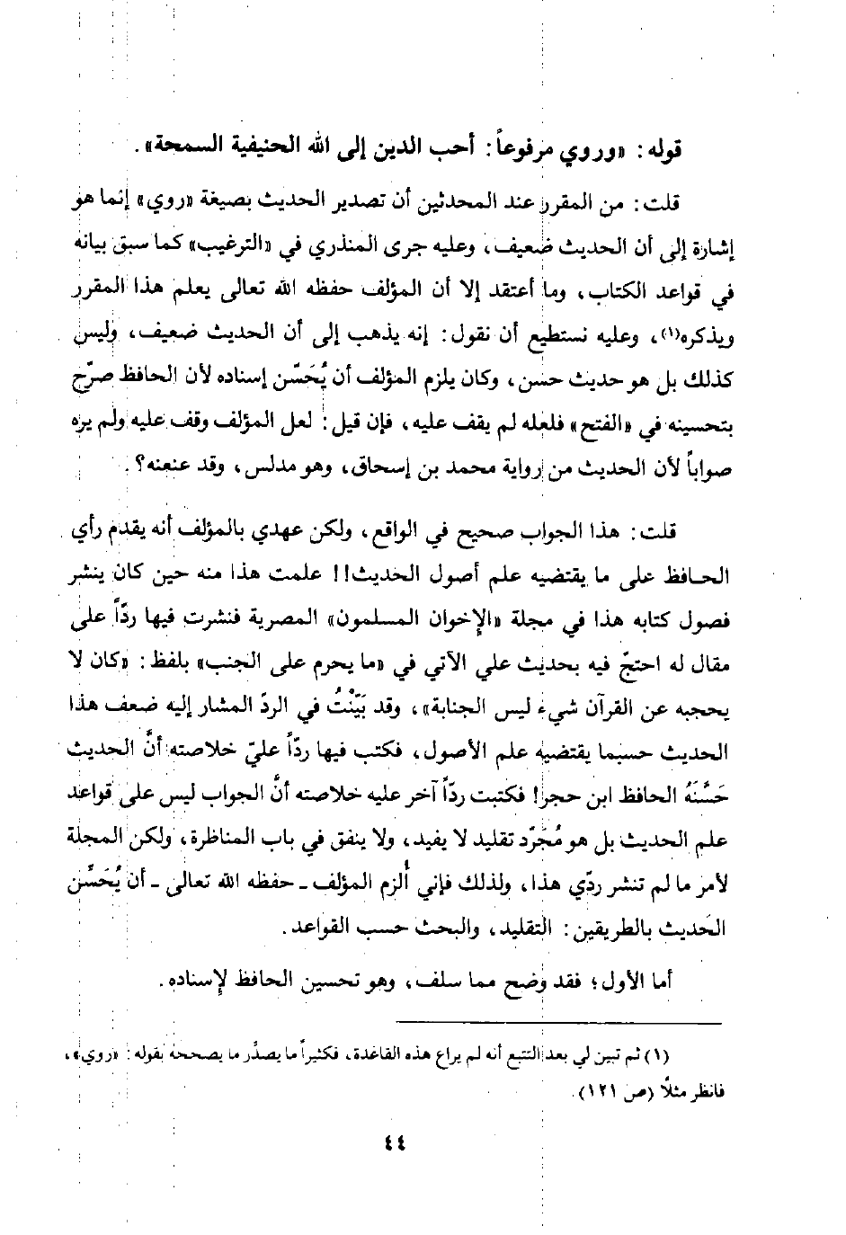 قلت: هذا الجواب صحيح في الواقع ولكن عهدي بالمؤلف أنه يقدم رأي الحافظ على ما يقتضيه علم أصول الحديث علمت هذا منه حين كان ينشر فصول كتابه هذا في مجلة "الإخوان المسلمون المصرية فنشرت فيها ردا على مقال له احتج فيه بحديث علي الآتي في "ما يحرم على الجنب" بلفظ: "كان لا يحجبه عن القرآن شيء ليس الجنابة" وقد بينت في الرد المشار إليه ضعف هذا الحديث حسبما يقتضيه علم الأصول فكتب فيها ردا علي خلاصته أن الحديث حسنه الحافظ ابن حجر فكتبت ردا آخر عليه خلاصته أن الجواب ليس على قواعد علم الحديث بل هو مجرد تقليد لا يفيد ولا ينفق في باب المناظرة ولكن المجلة لأمر ما لم تنشر ردي هذا ولذلك فإني ألزم المؤلف - حفظه الله تعالى - أن يحسن الحديث بالطريقين: التقليد والبحث حسب القواعد