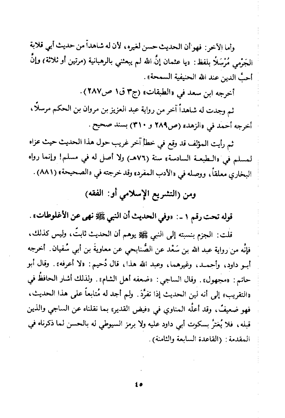 وأما الآخر: فهو أن الحديث حسن لغيره لأن له شاهدا من حديث أبي قلابة الجرمي مرسلا بلفظ: "يا عثمان إن الله لم يبعثني بالرهبانية مرتين أو ثلاثة لأن أحب الدين عند الله الحنيفية السمحة".