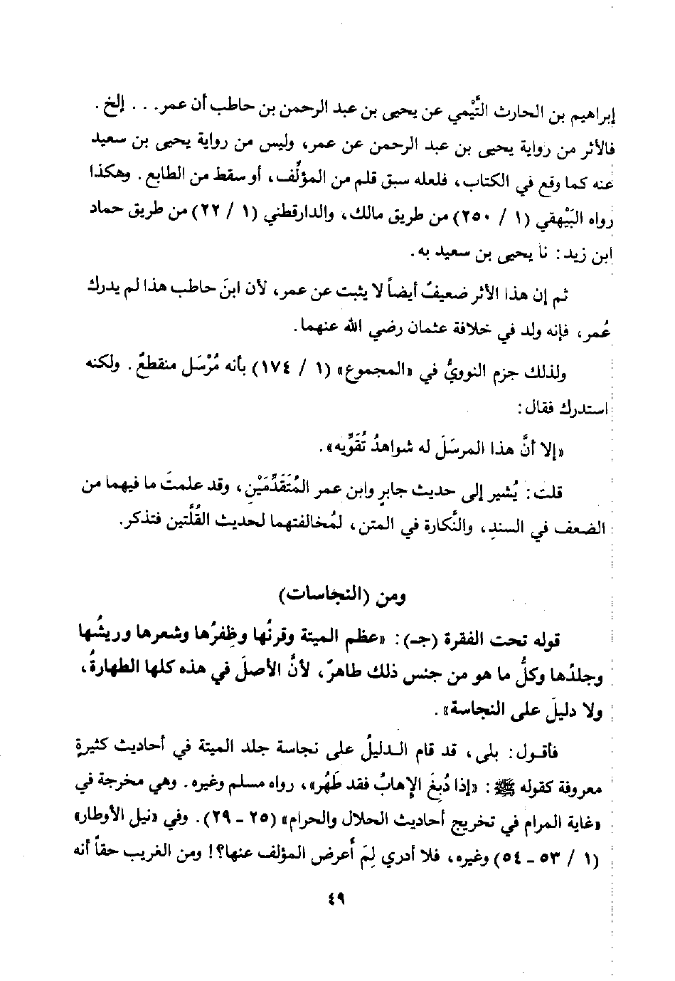 قوله تحت الفقرة ج: "عظم الميتة وقرنها وظفرها وشعرها وريشها وجلدها وكل ما هو من جنس ذلك طاهر لأن الأصل في هذه كلها الطهارة ولا دليل على النجاسة".